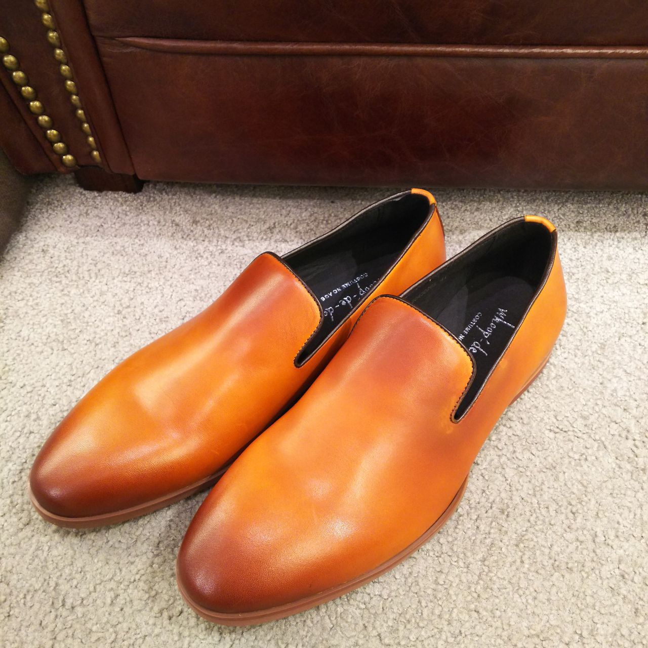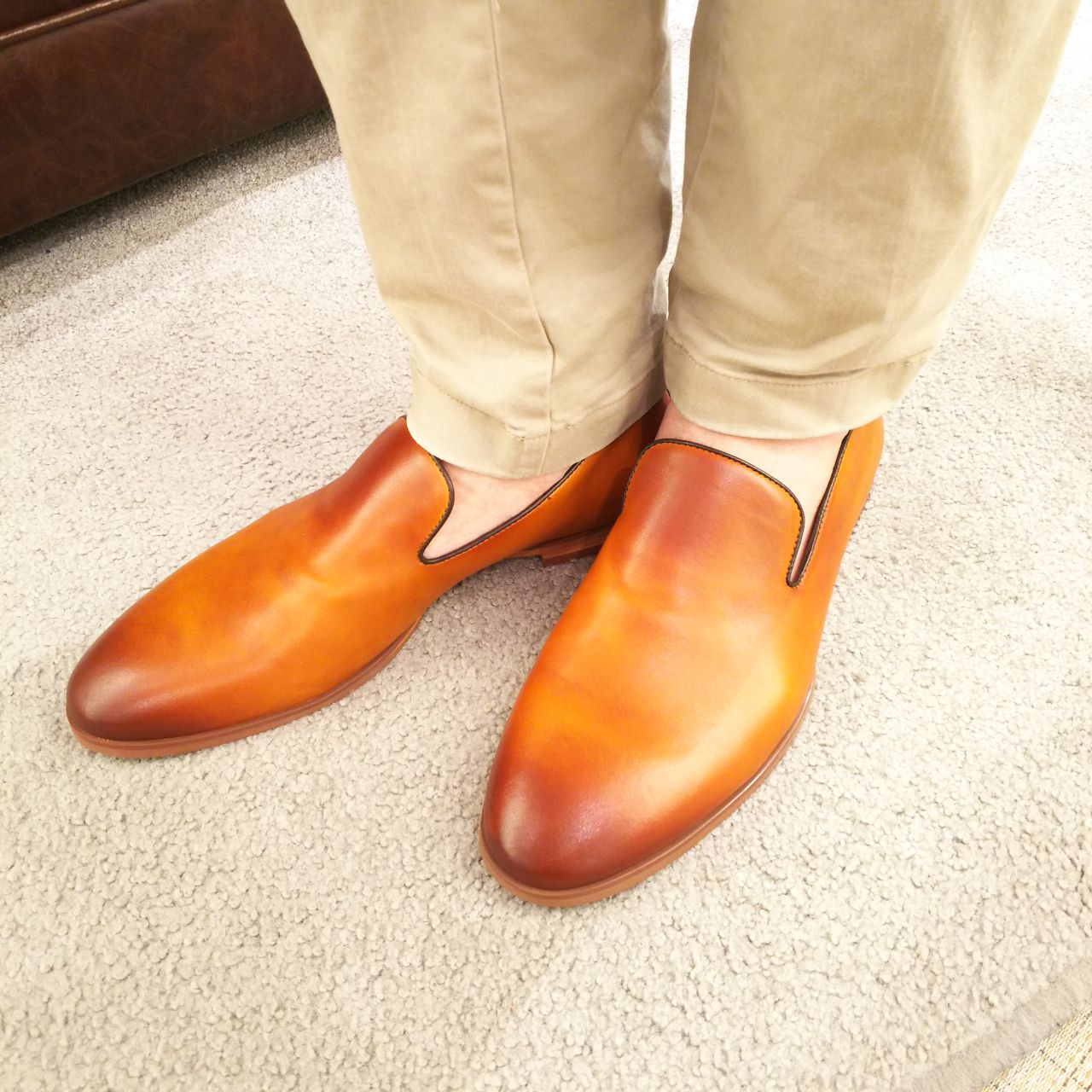 アッパーのレザーは高級感ある染色とクリーム仕上げられたレザーで上品な艶感が特徴です。継ぎ目のない1枚の甲革で作られているのは贅沢ですよね。