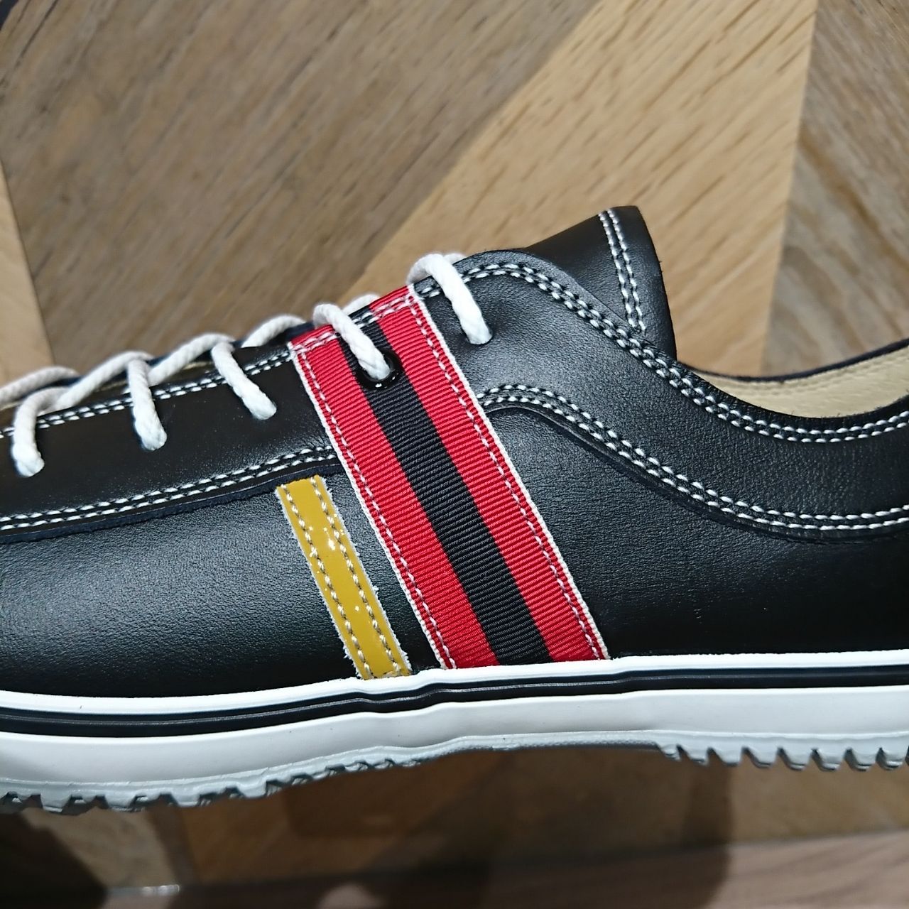 アッパーに柔らかいスムースレザーを使用し、今回のリボンは赤との組み合わせで
