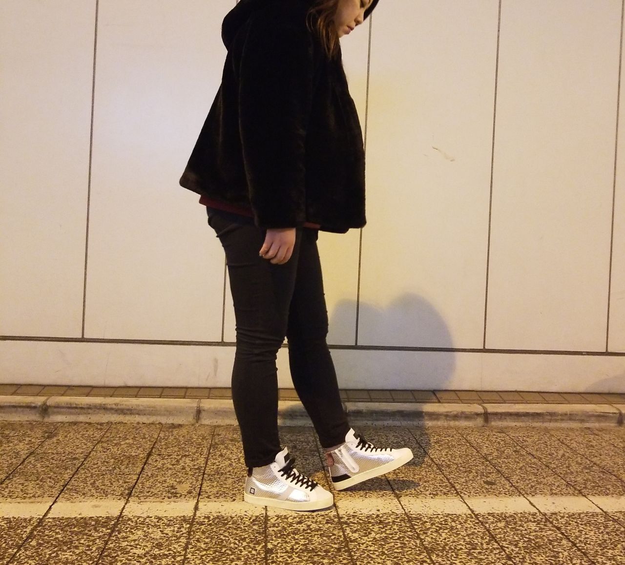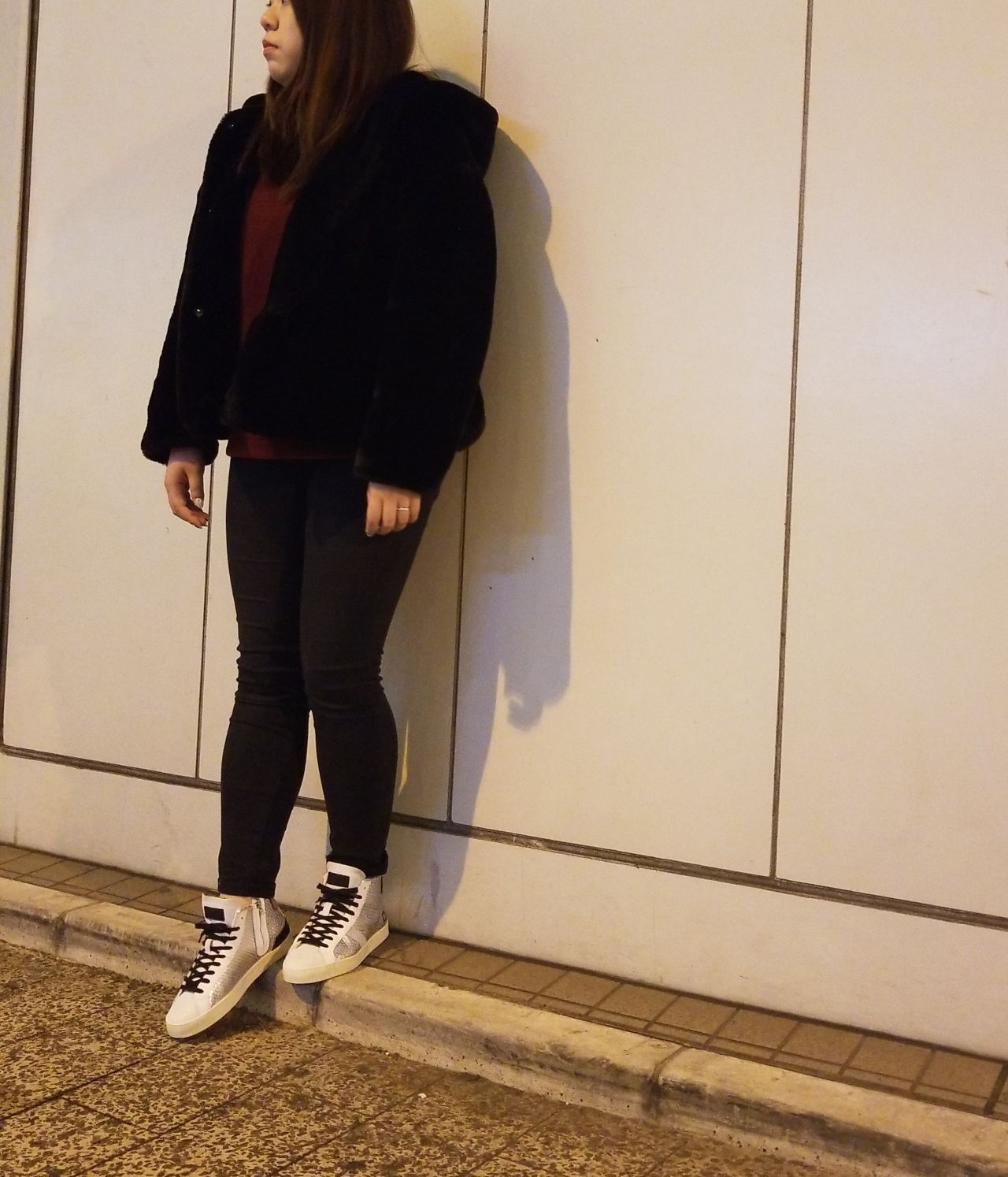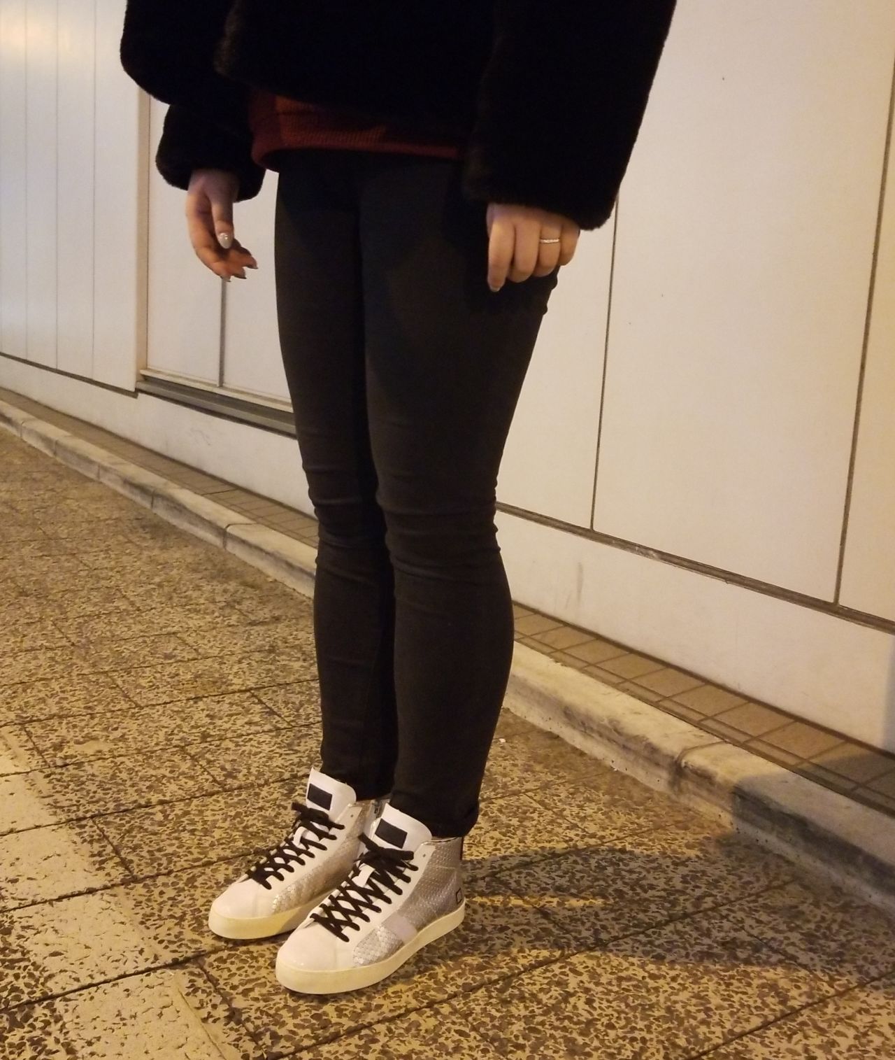 今回はスキニーで合わせていますが、ハイカットスニーカーは足首を引き締めて見せるのでワイドパンツとの相性も抜群ですよ!