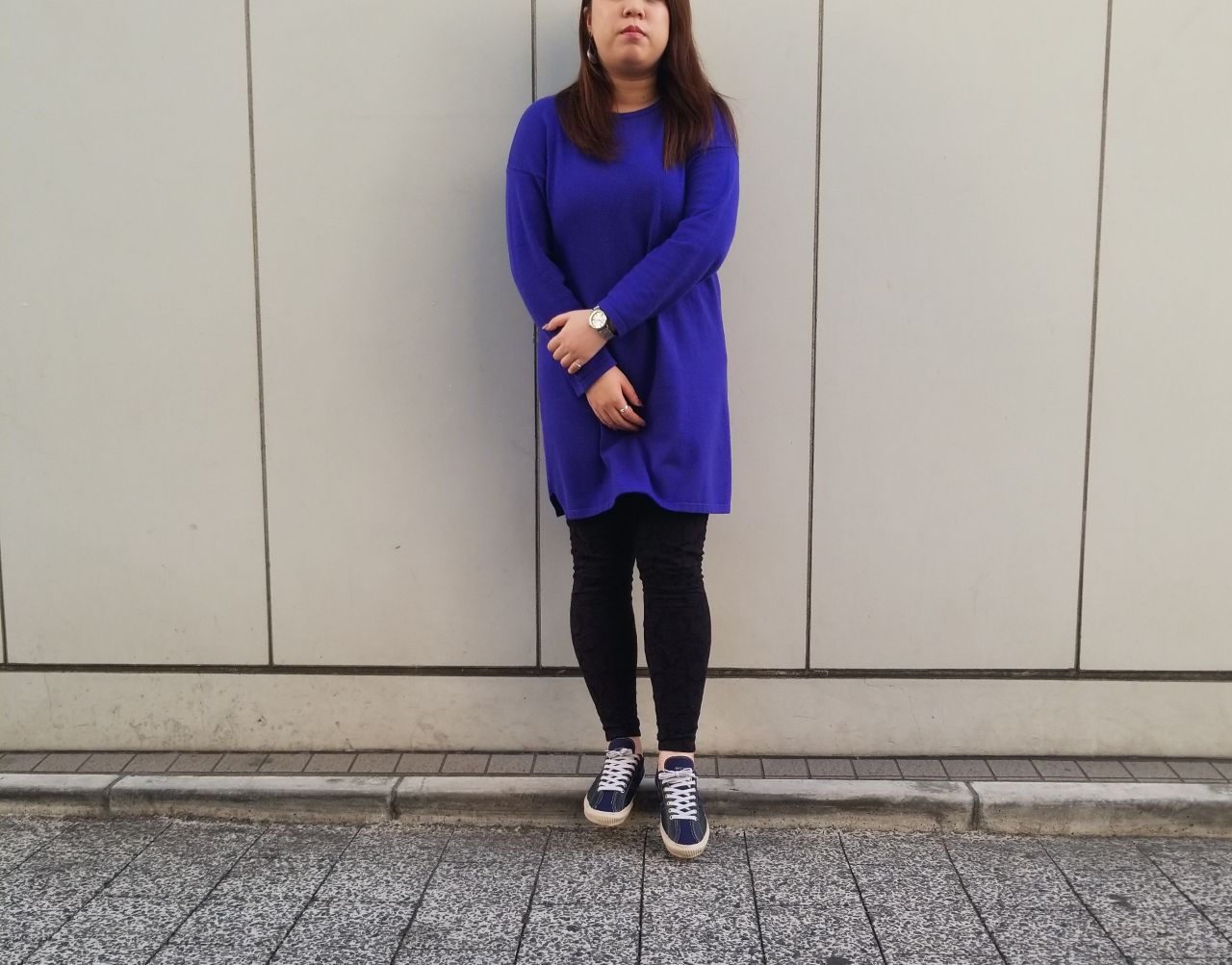 NAVY ERRAにブルーのニットワンピース×黒のレギンスを合わせて◎