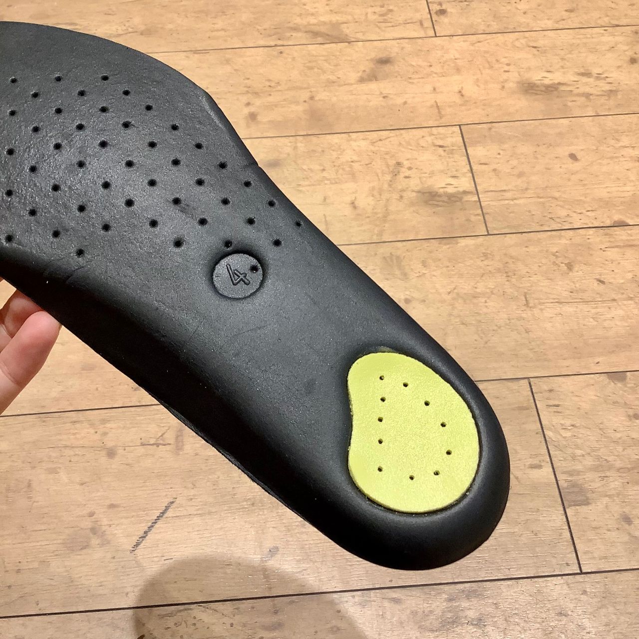 インソールとかかと部にXRD(画像黄色部)という衝撃吸収クッションが付いているので