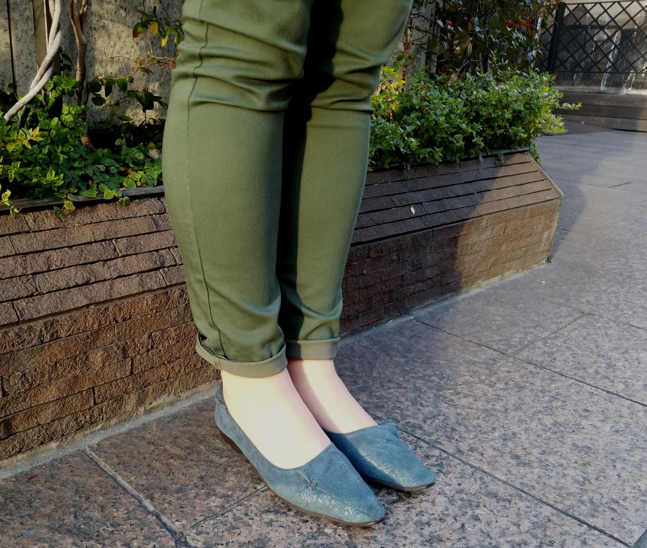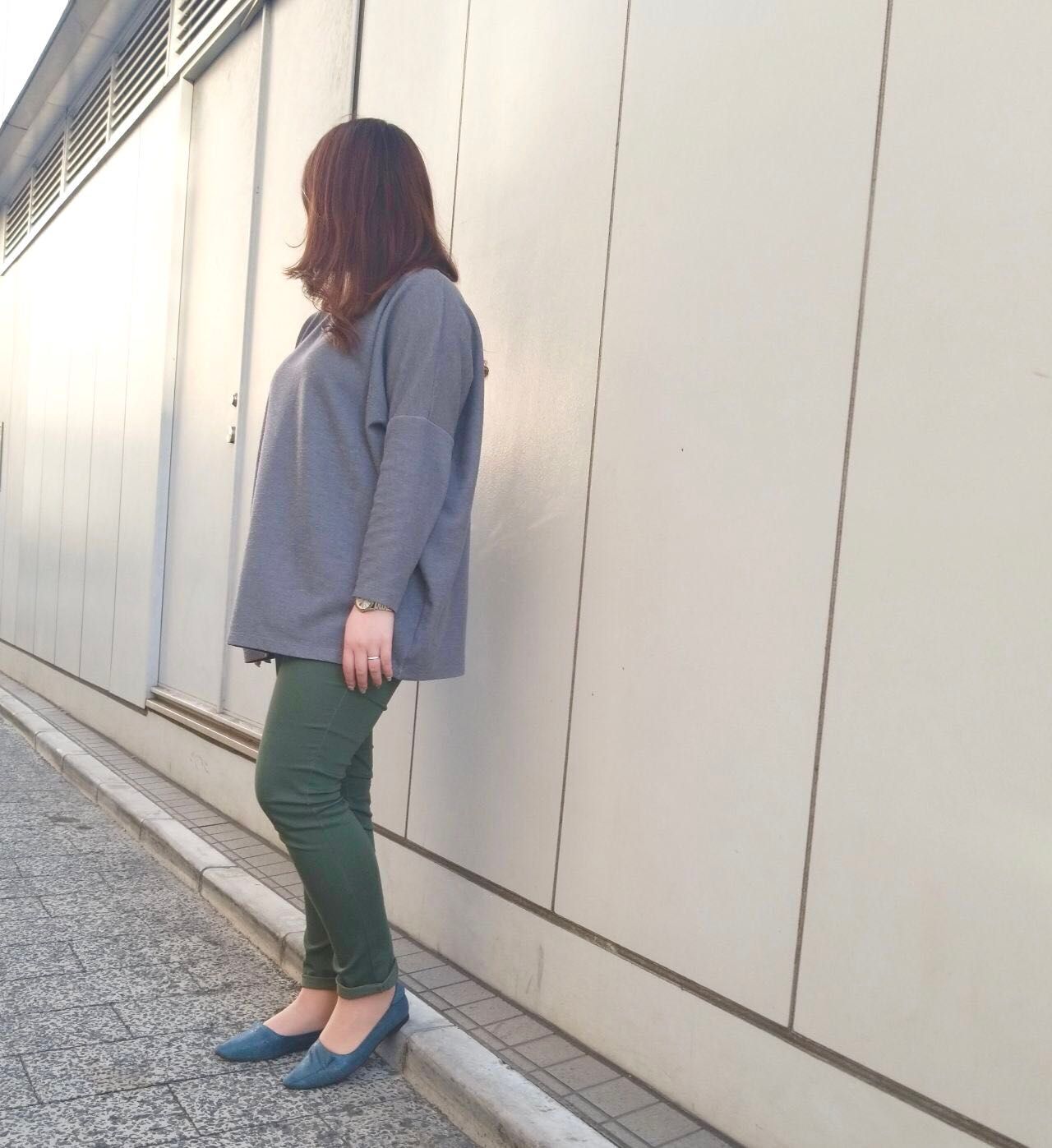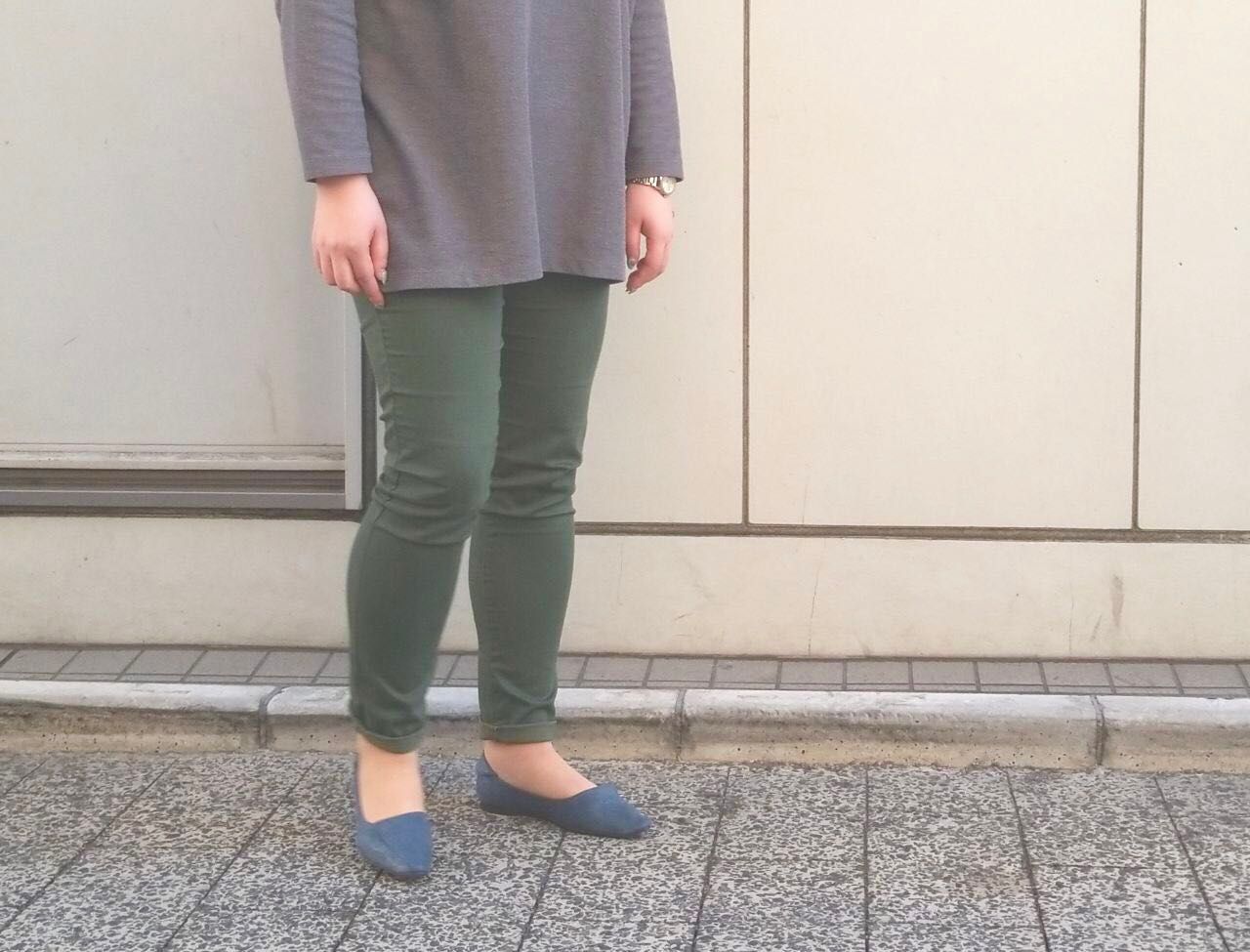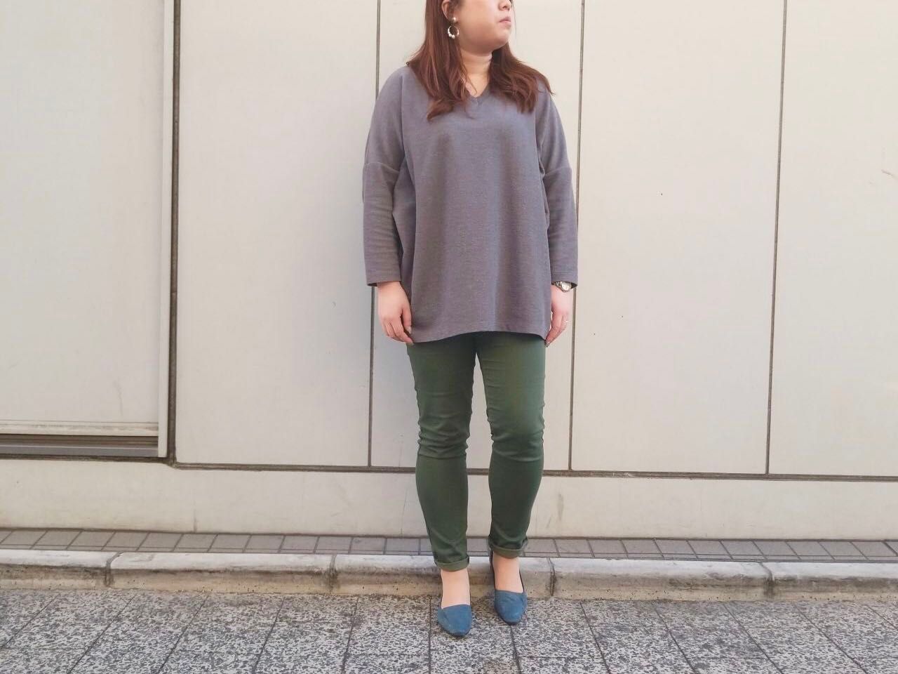 BU/FWにグレーのトップスとカーキのスキニーパンツを合わせて◎