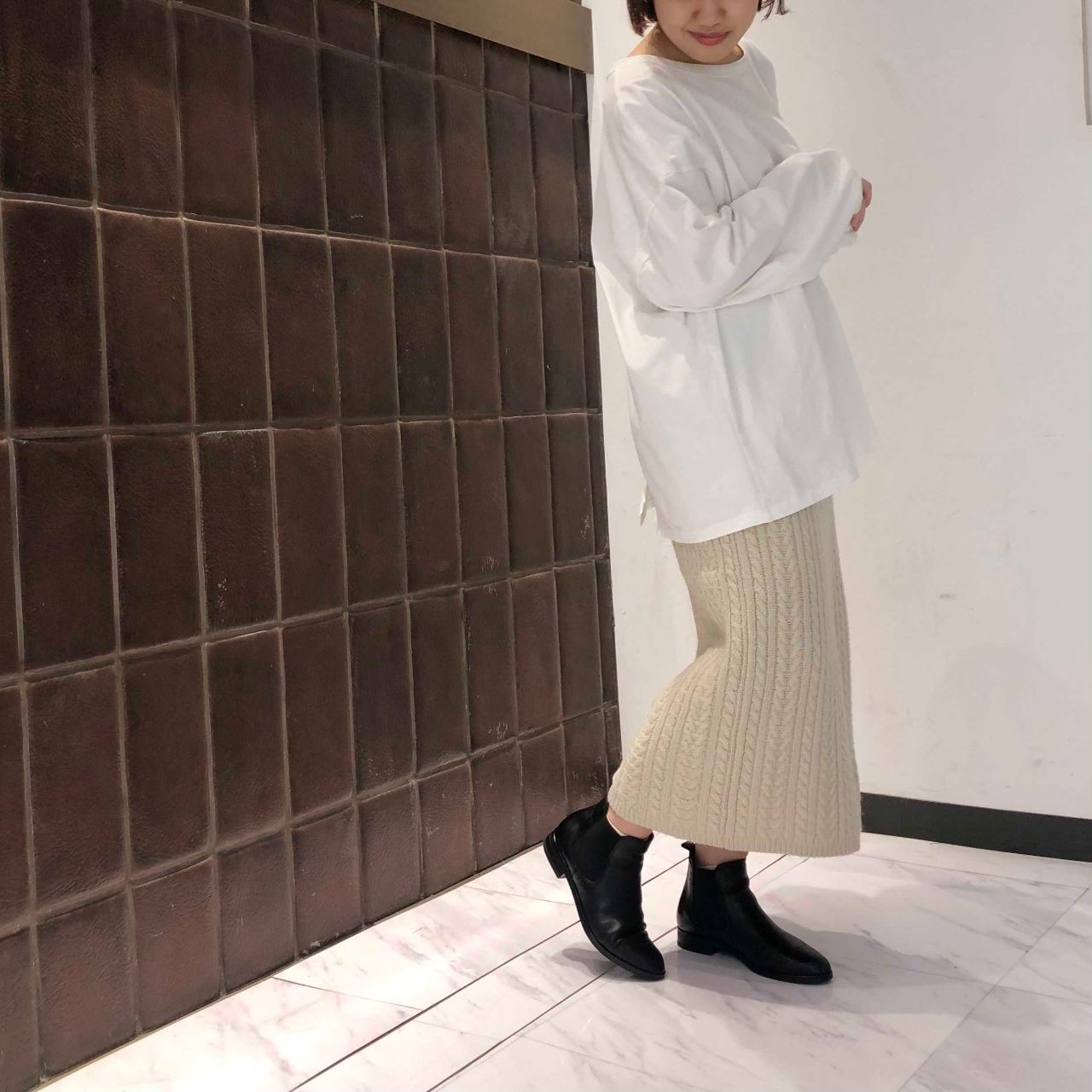 ホワイトのカットソー×ニットスカートにNEROを合わせて◎