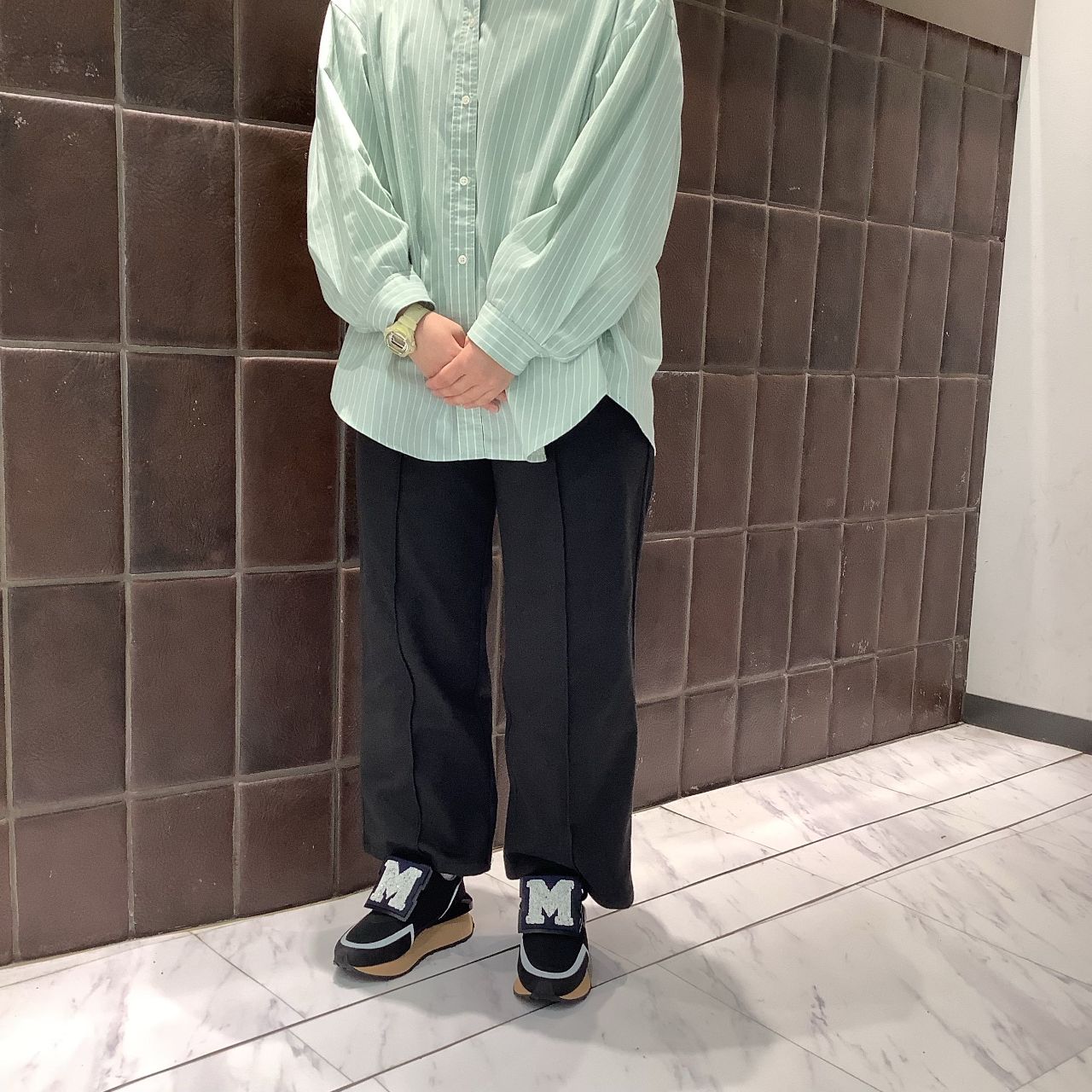 Mロゴでしっかり足元から印象を付けつつ、モノトーンで落ち着いた印象に!
