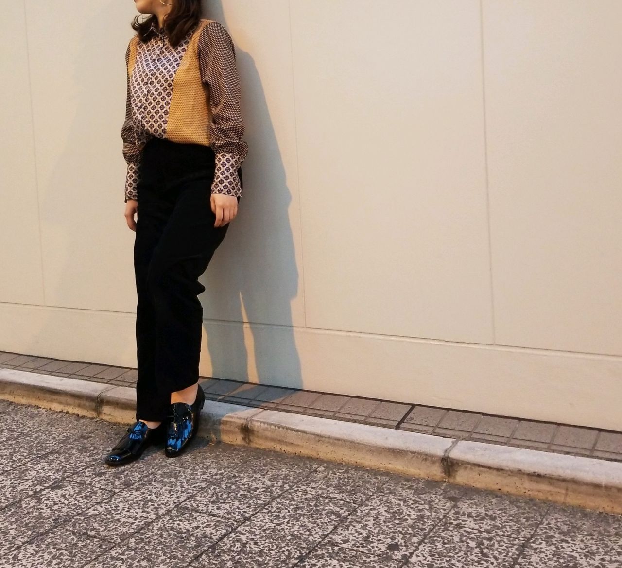 トップスの柄がインパクトがあるのでパンツ、シューズ共にブラックでまとめました。