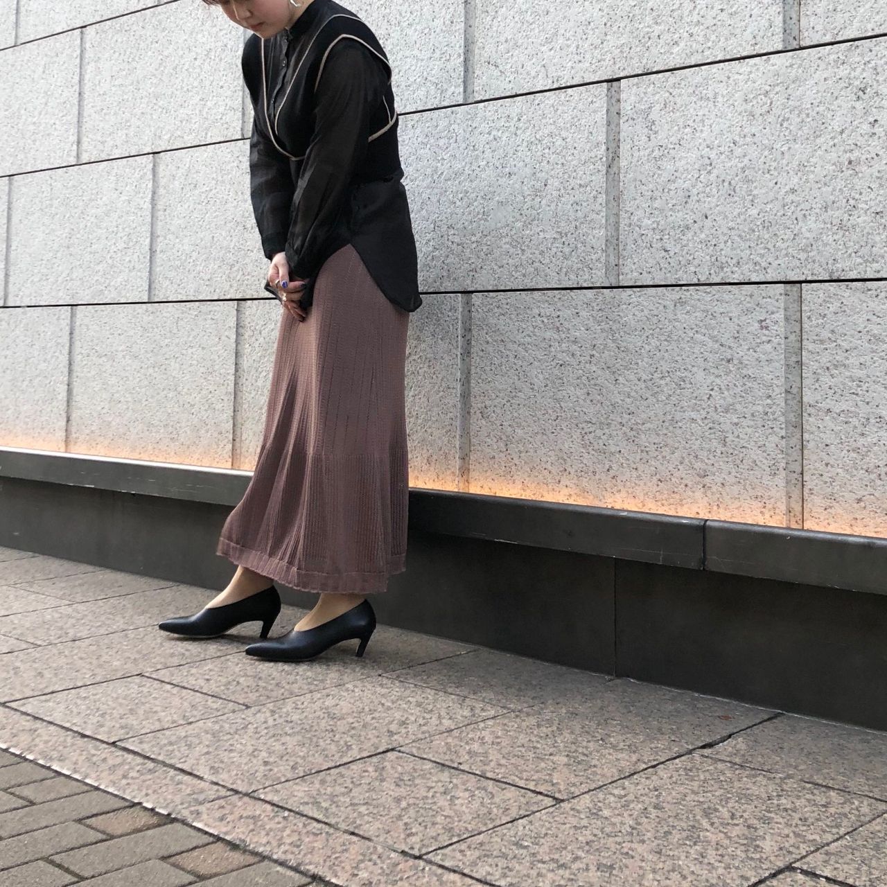 ブラックシアーシャツ×ブラックニットベスト×ピンクレーススカートにBLKを合わせて◎