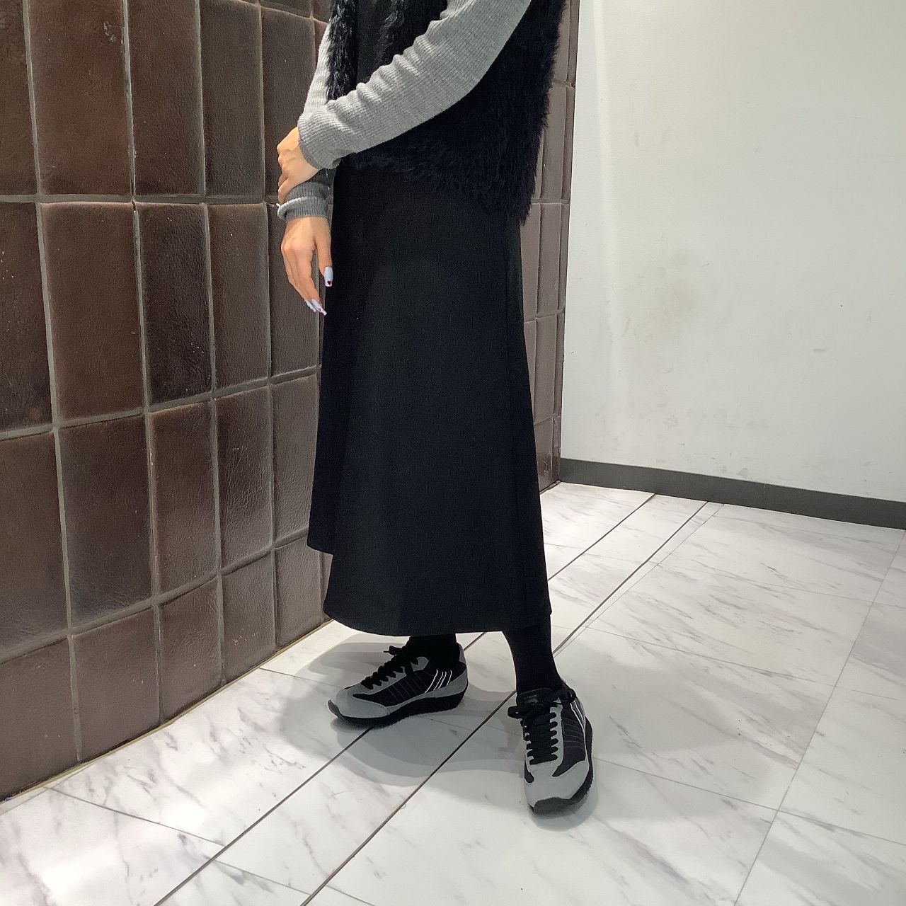 ジャンパースカートと合わせて黒×グレーのコーディネートに。