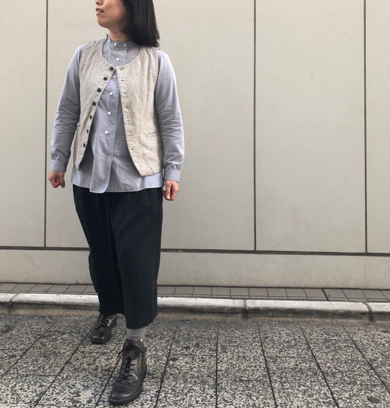 ブルーシャツ×ネイビーのキュロットスカートにグレーレギンスとGRYを合わせて◎