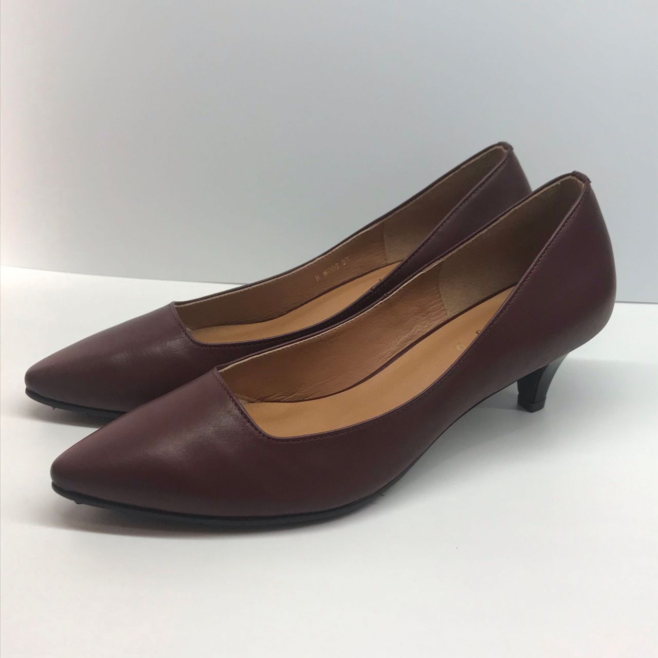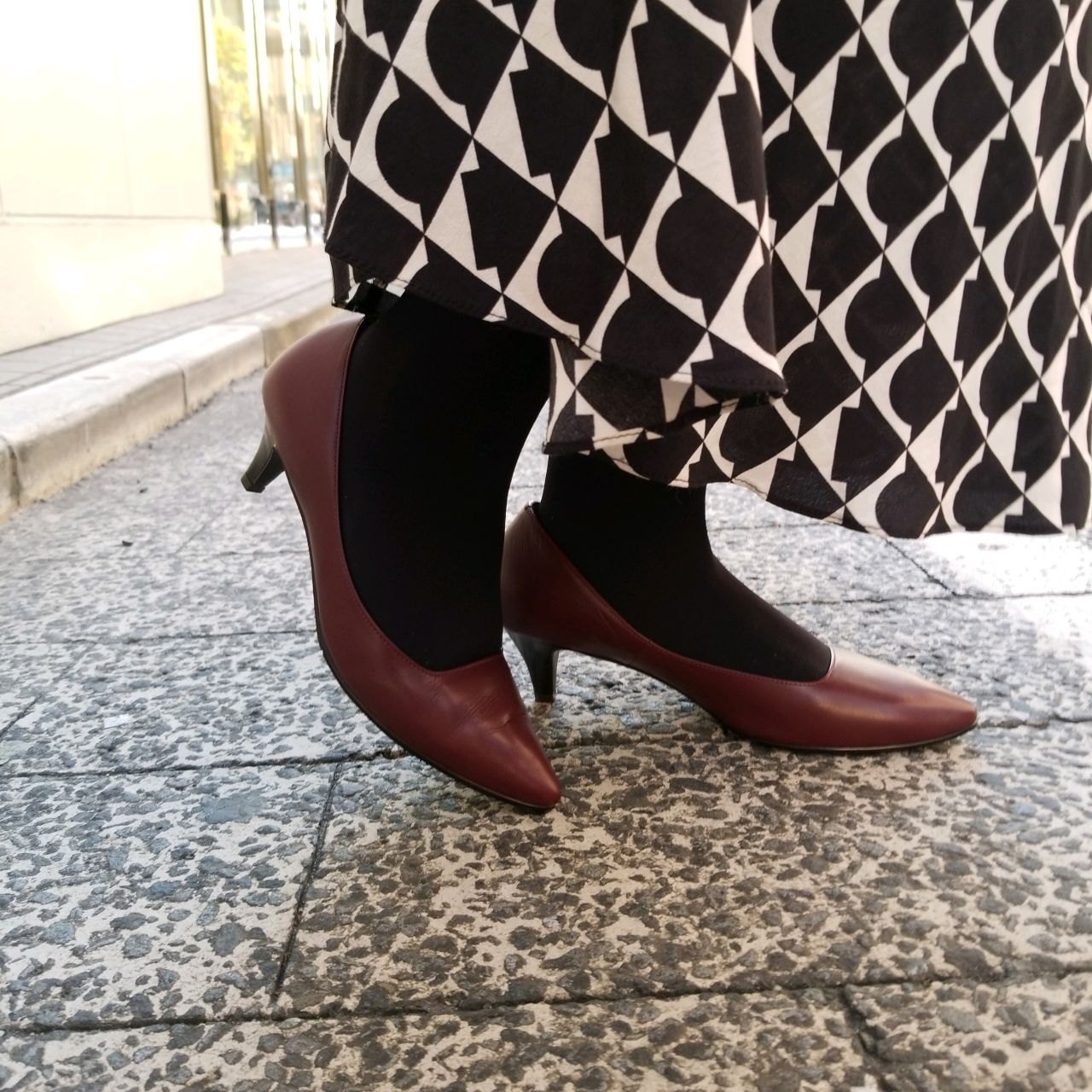 モノトーンの柄ワンピースにワインカラーを合わせ、レトロな雰囲気で履いてみました。