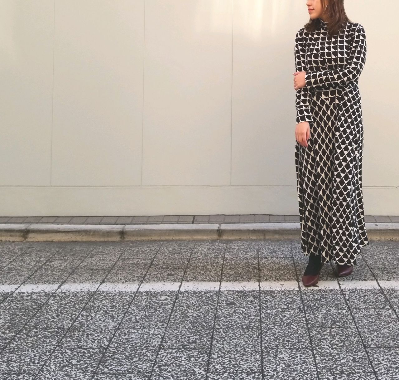 モノトーンの幾何学模様のワンピース×黒タイツにWINEを合わせて◎