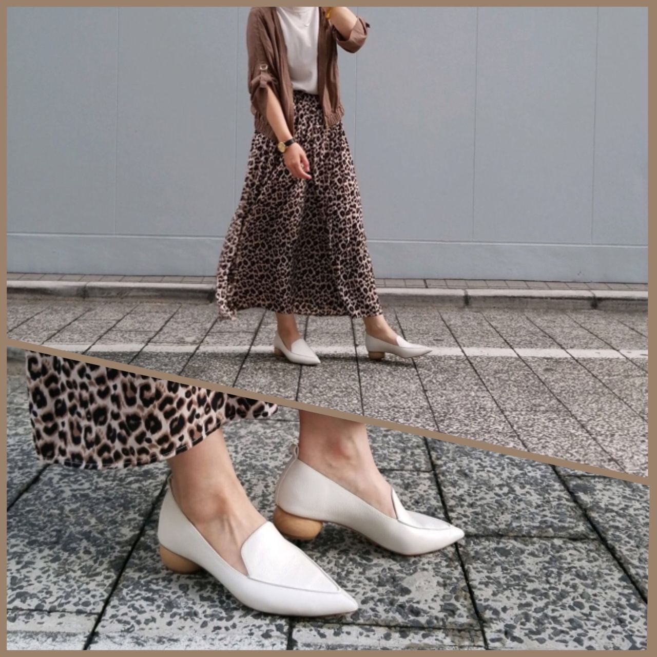 全体をトレンドのブラウンカラーでまとめ、アニマル柄のスカートでメリハリをもたせたスタイリングです。