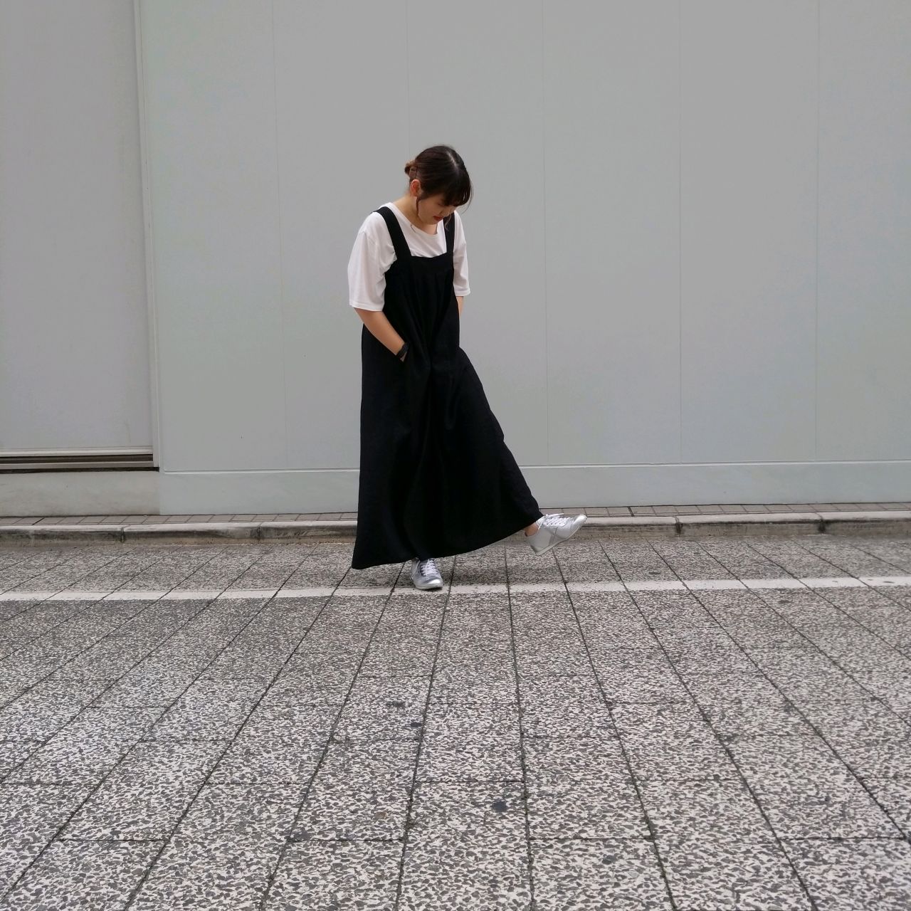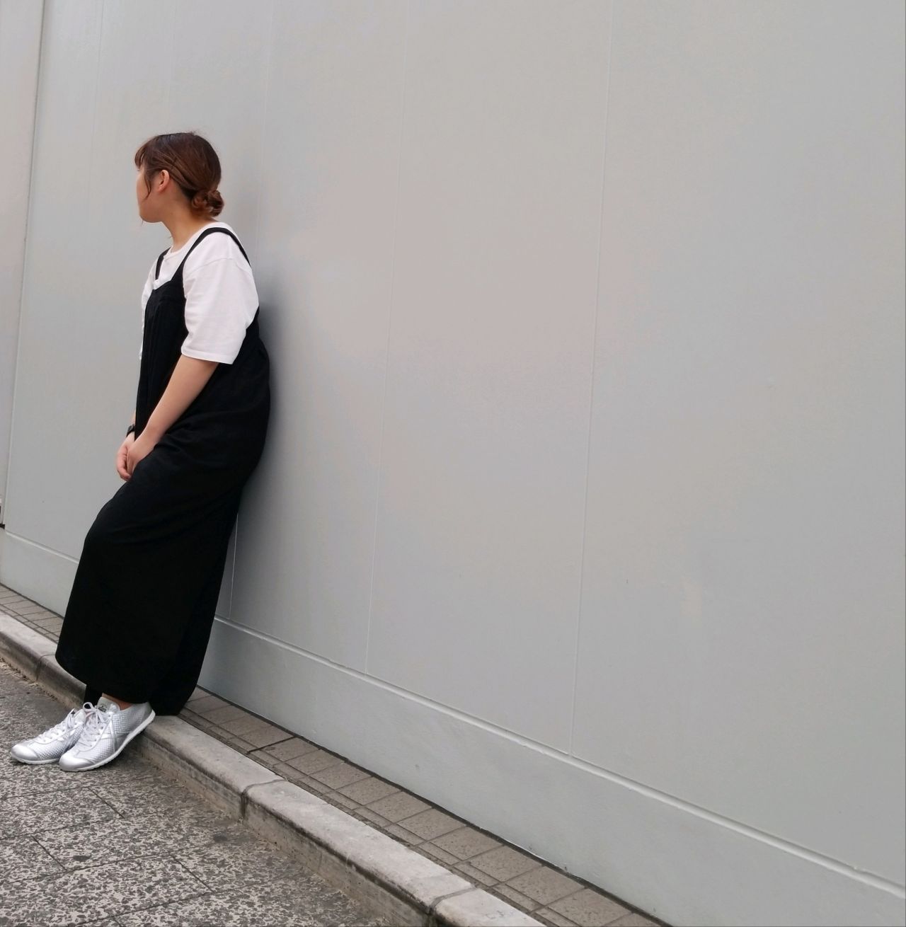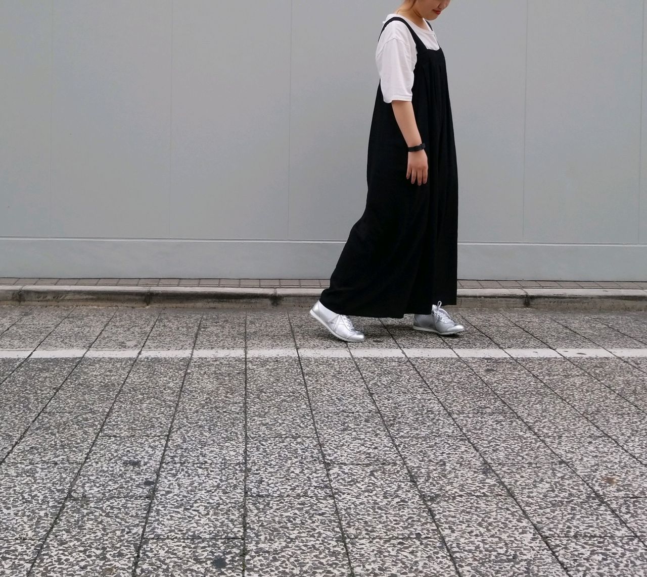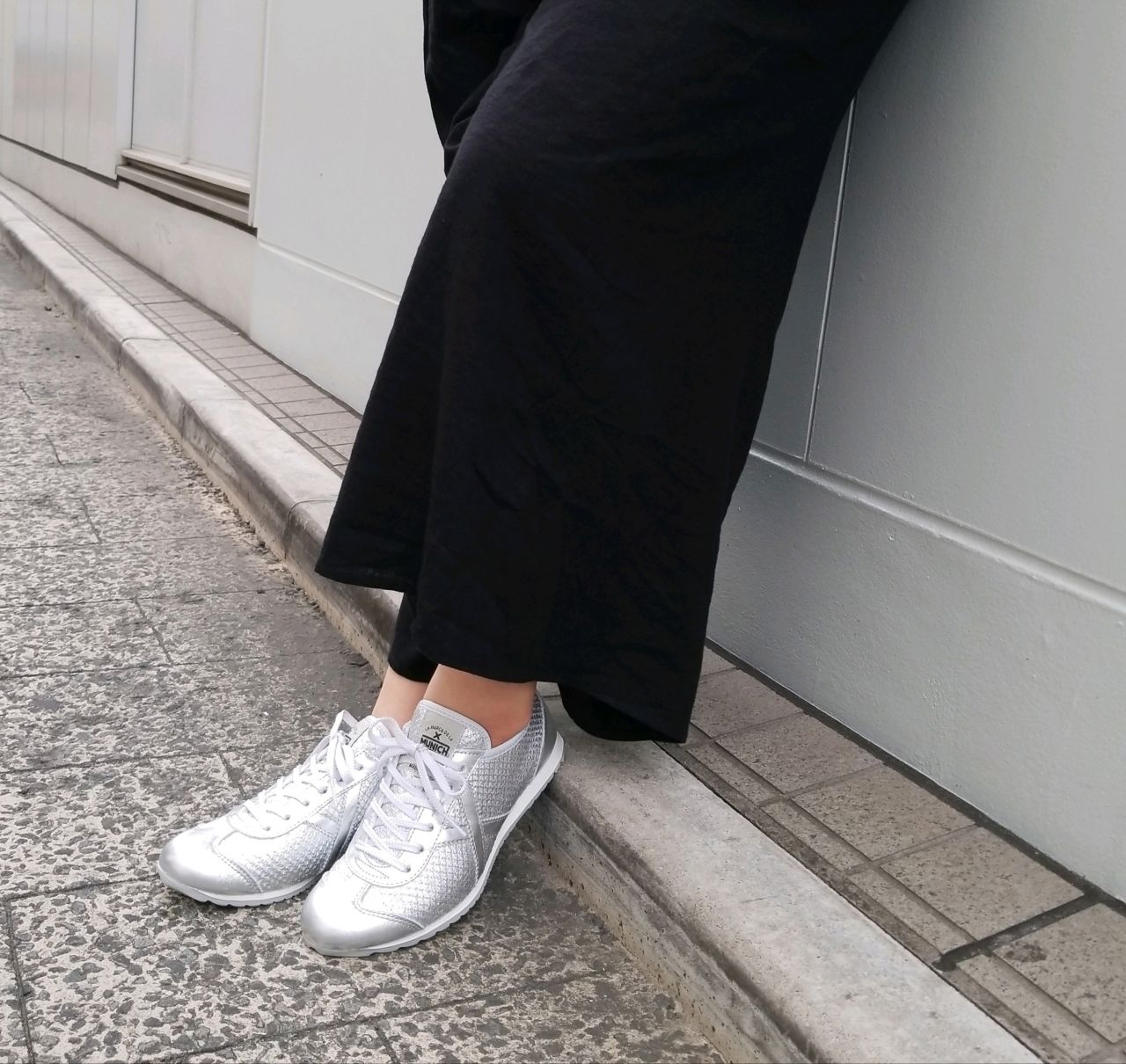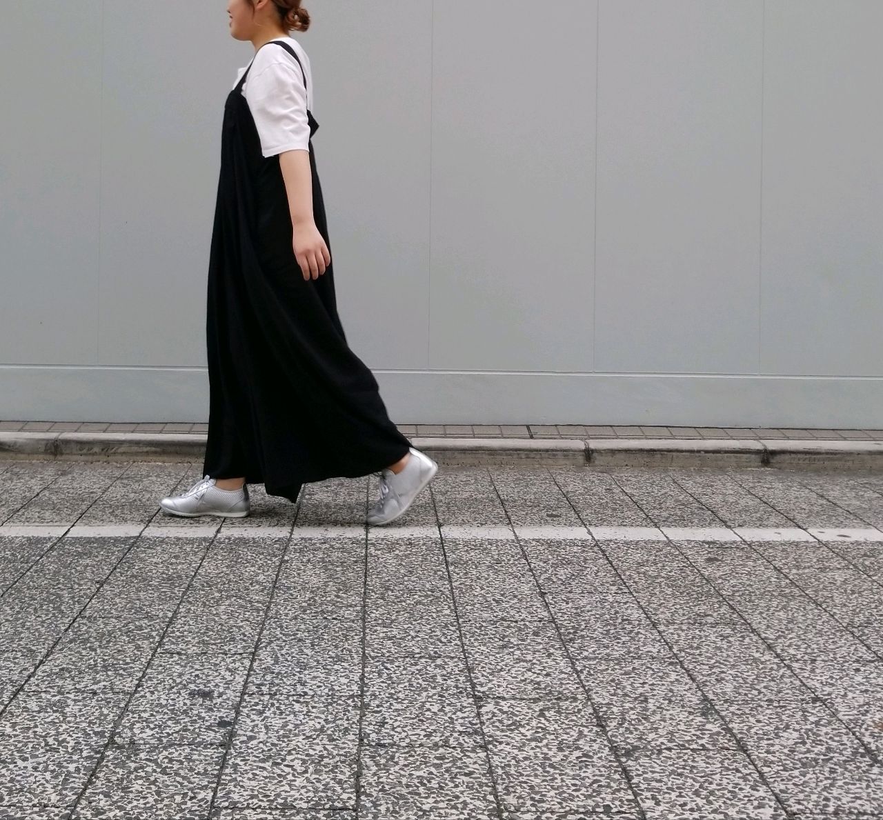 足もとのメタリック感が程よく抜け感を出してくれるのでブラックカラーでも重たくならないですよ。