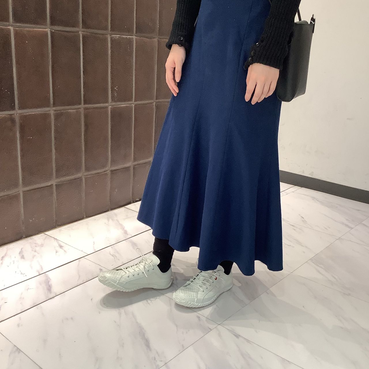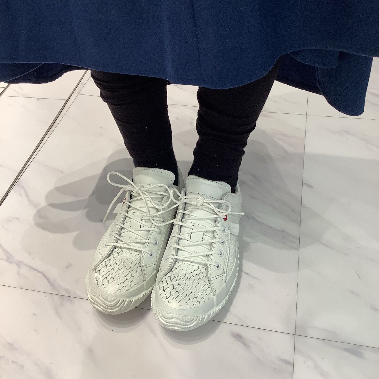 白い靴なので合わせると爽やかな印象になります。デニムとも相性が良さそうです◎
