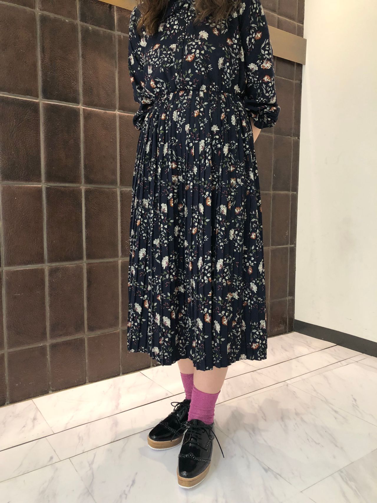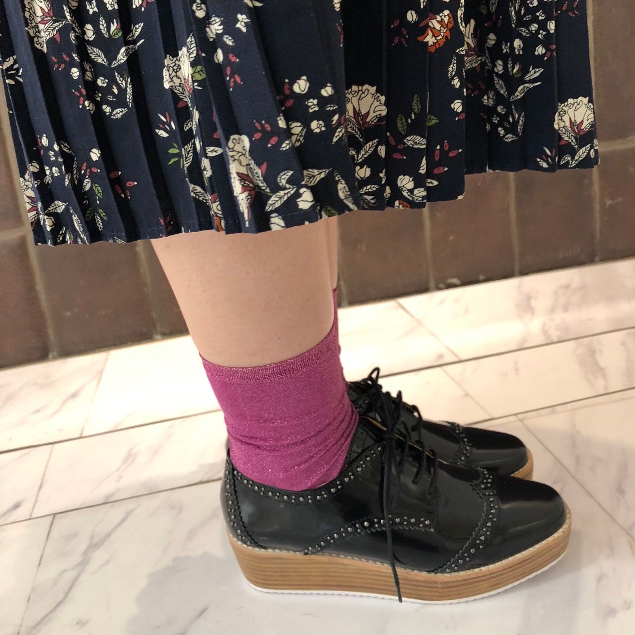 レトロな花柄ワンピースにビビッドなピンクの靴下で履いてもらいました