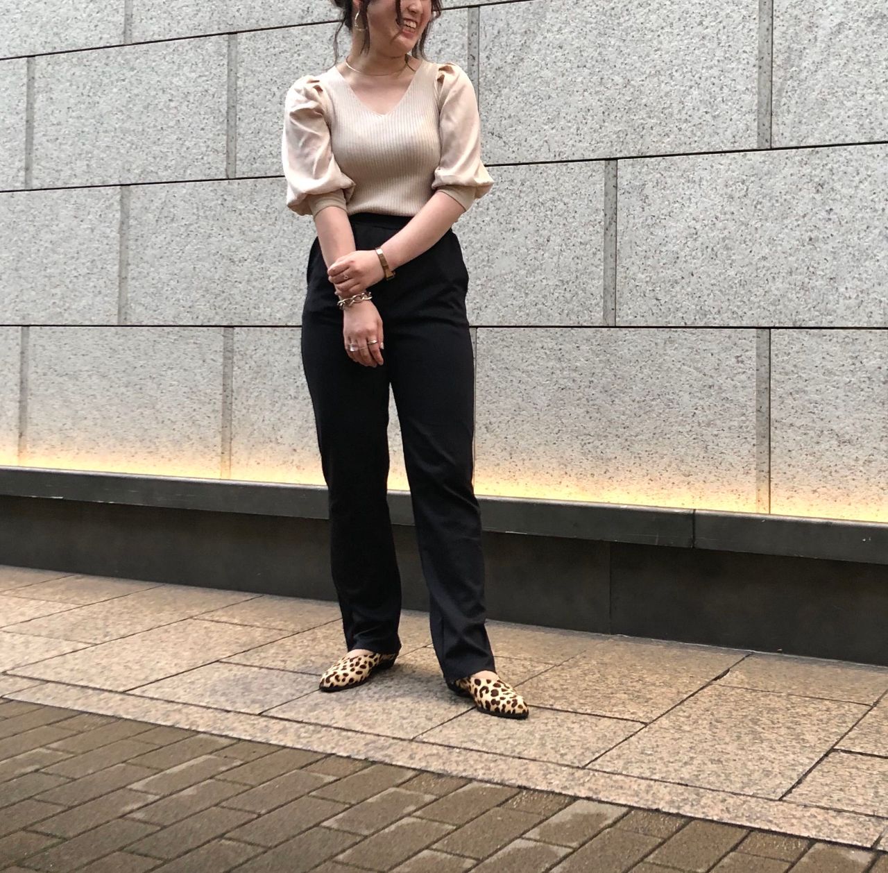 ベージュのサマーリブニット×ブラックストレートパンツにLEOを合わせて◎