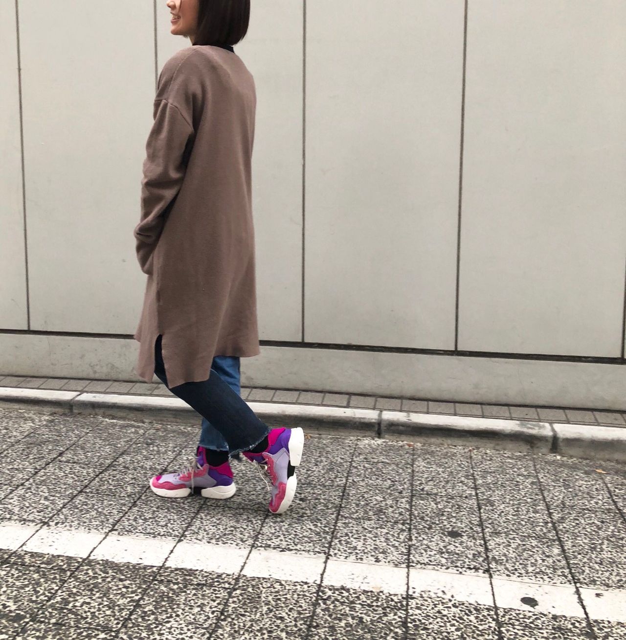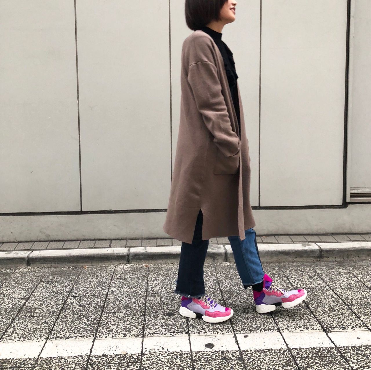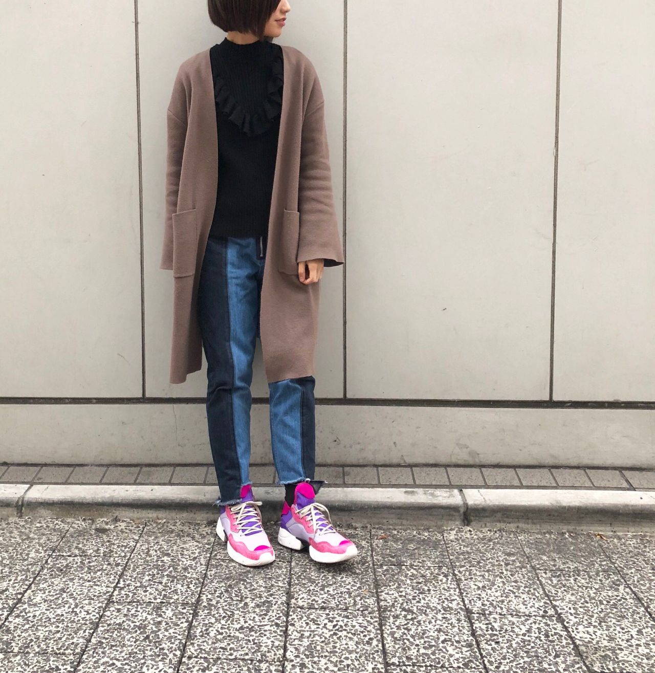 ブラックニット×デザインデニムパンツとモカ色のロングカーデにPPを合わせて◎