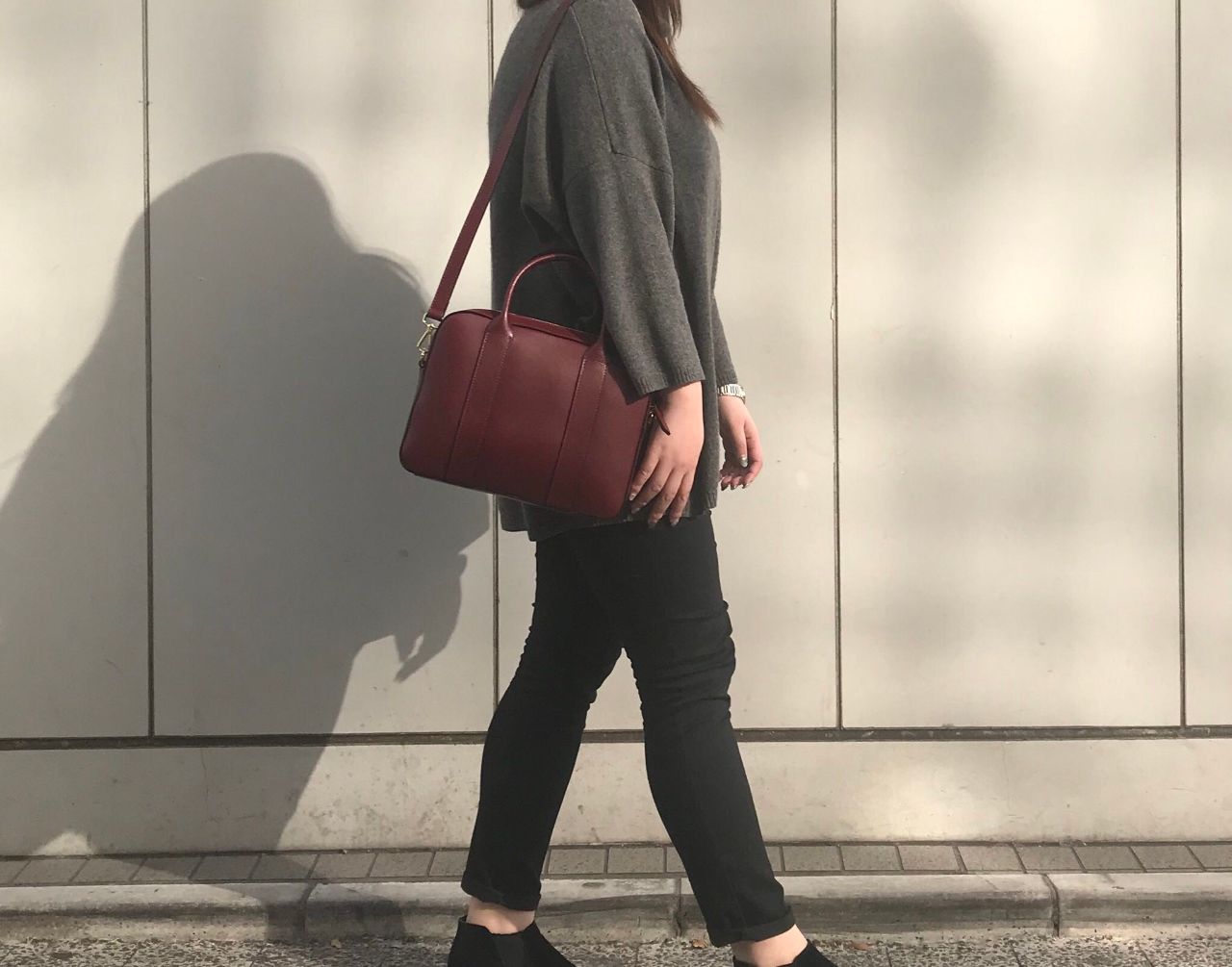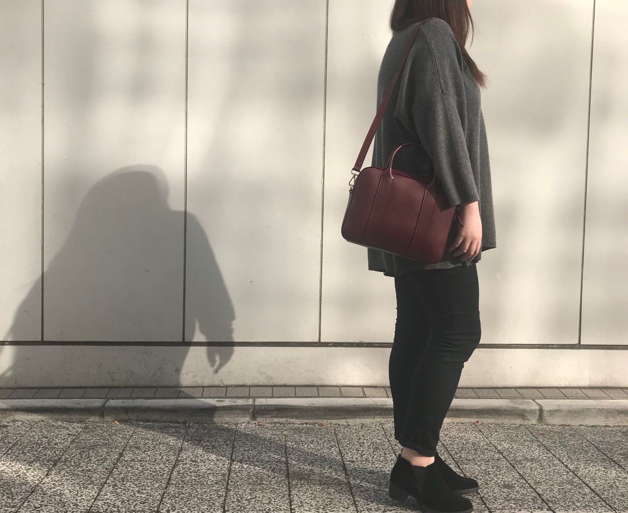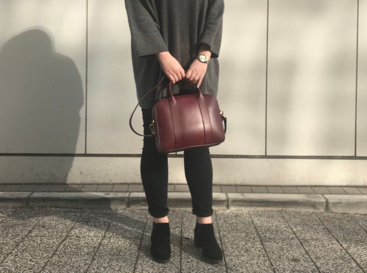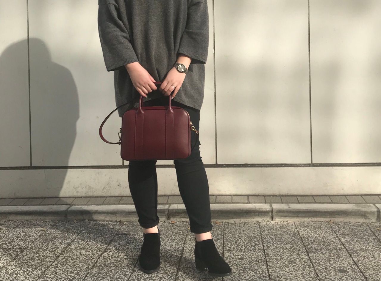 上品なボルドーカラーがポイントになってラフなコーディネートもメリハリが出ますよ!