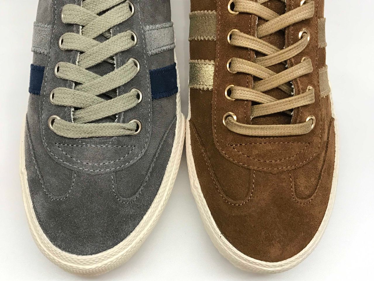 アッパーと同系色のシューレースを合わせているので、スッキリとした足元で大人っぽく履いていただけますね。