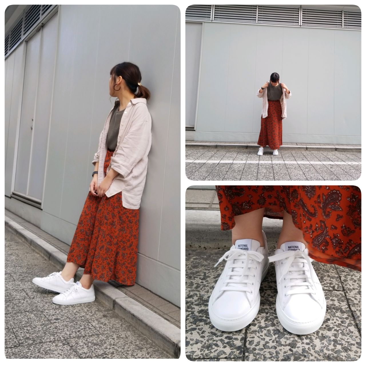 ベージュのシャツ+カーキのトップス+ペイズリー柄のテラコッタカラーのスカート×WHを合わせて◎