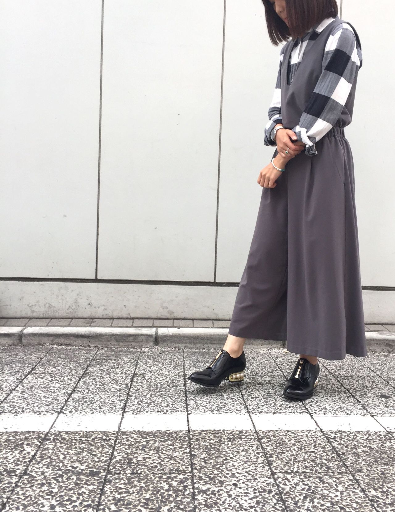 フロントファスナーのデザインをグレーのサロペットに合わせて◎