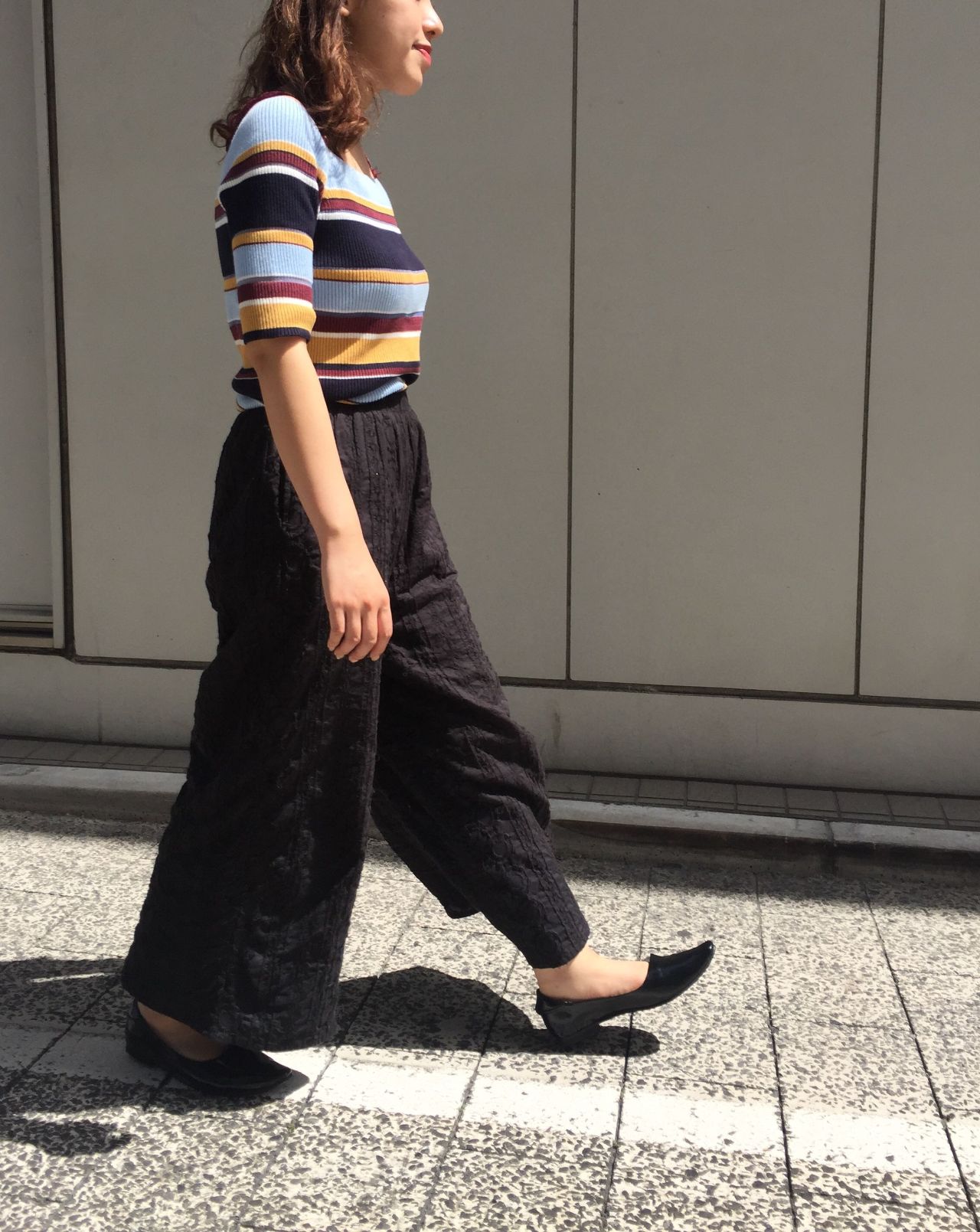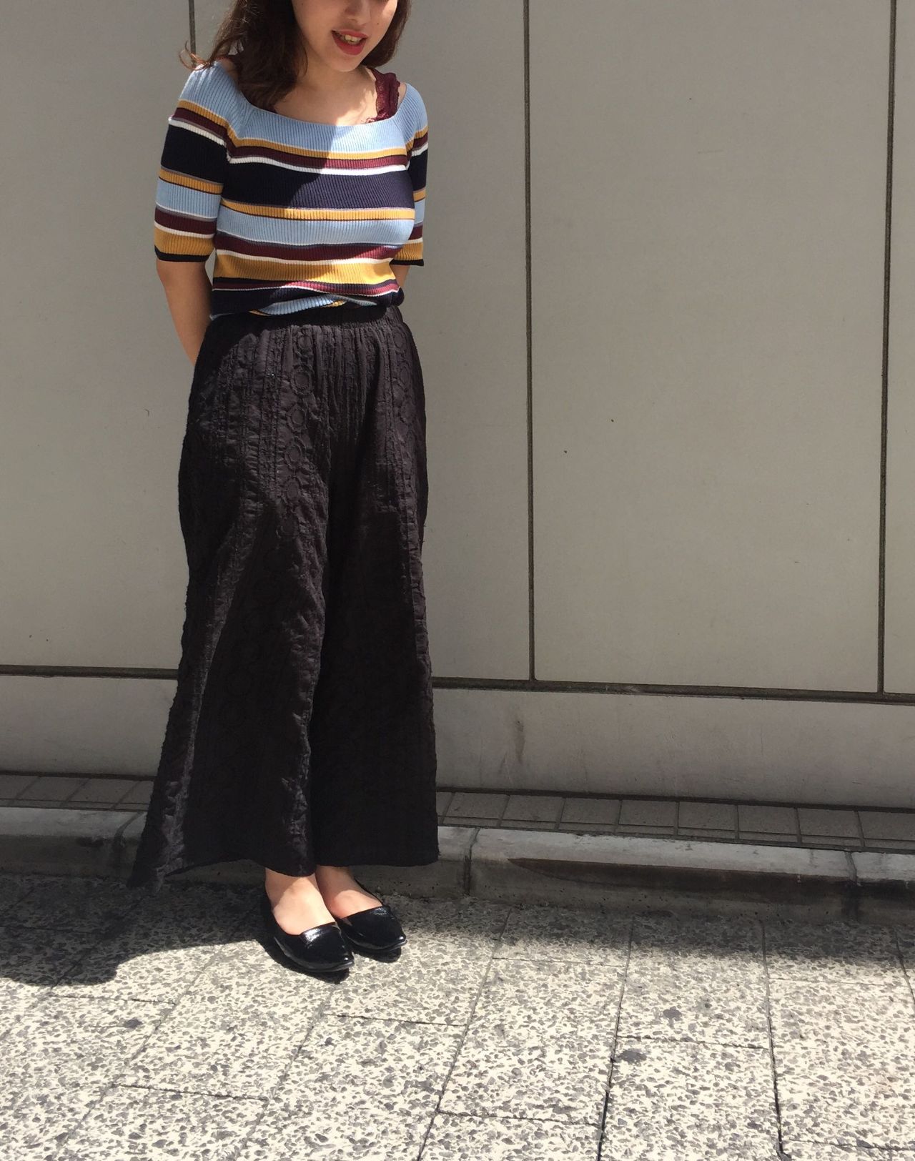 カラーボーダートップスとブラックワイドパンツにBLK3を合わせて◎