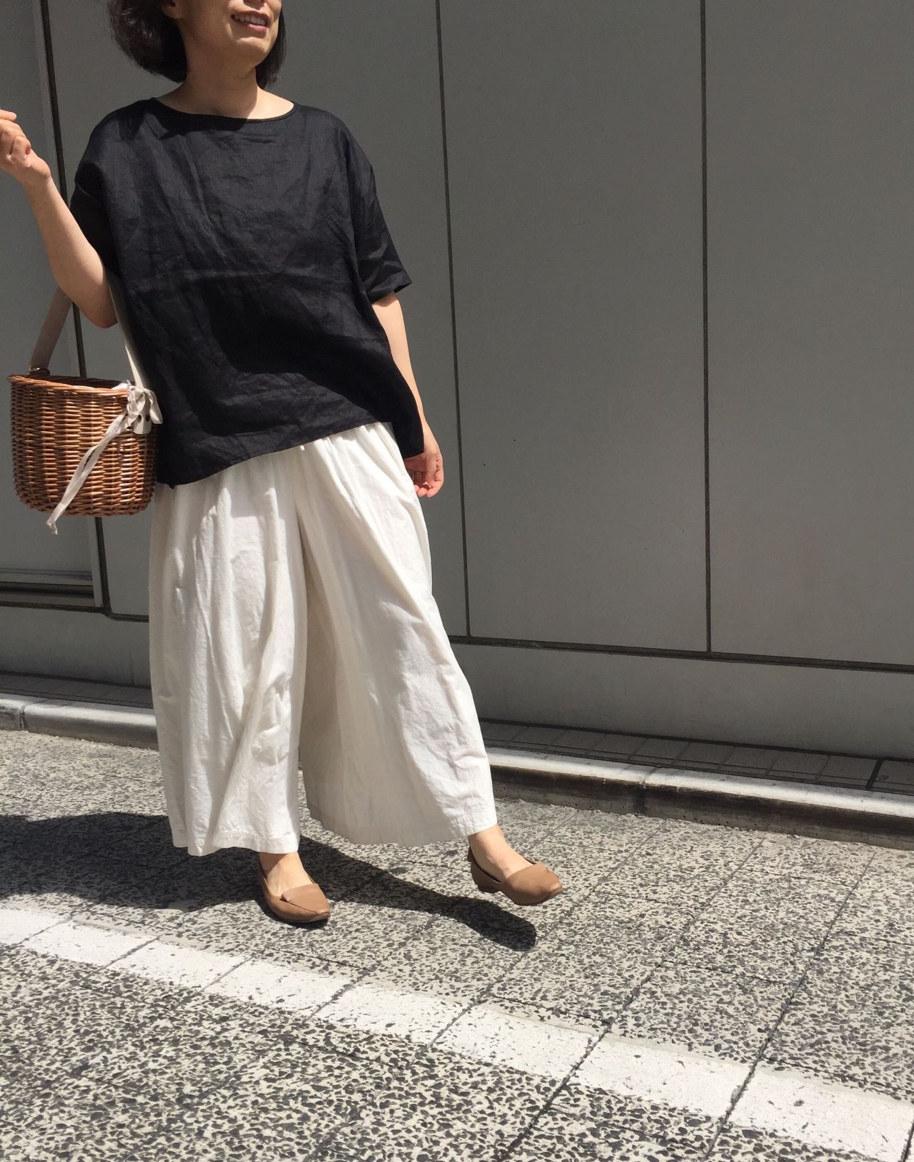 夏らしいリネン素材の上下にD/BGを合わせて◎