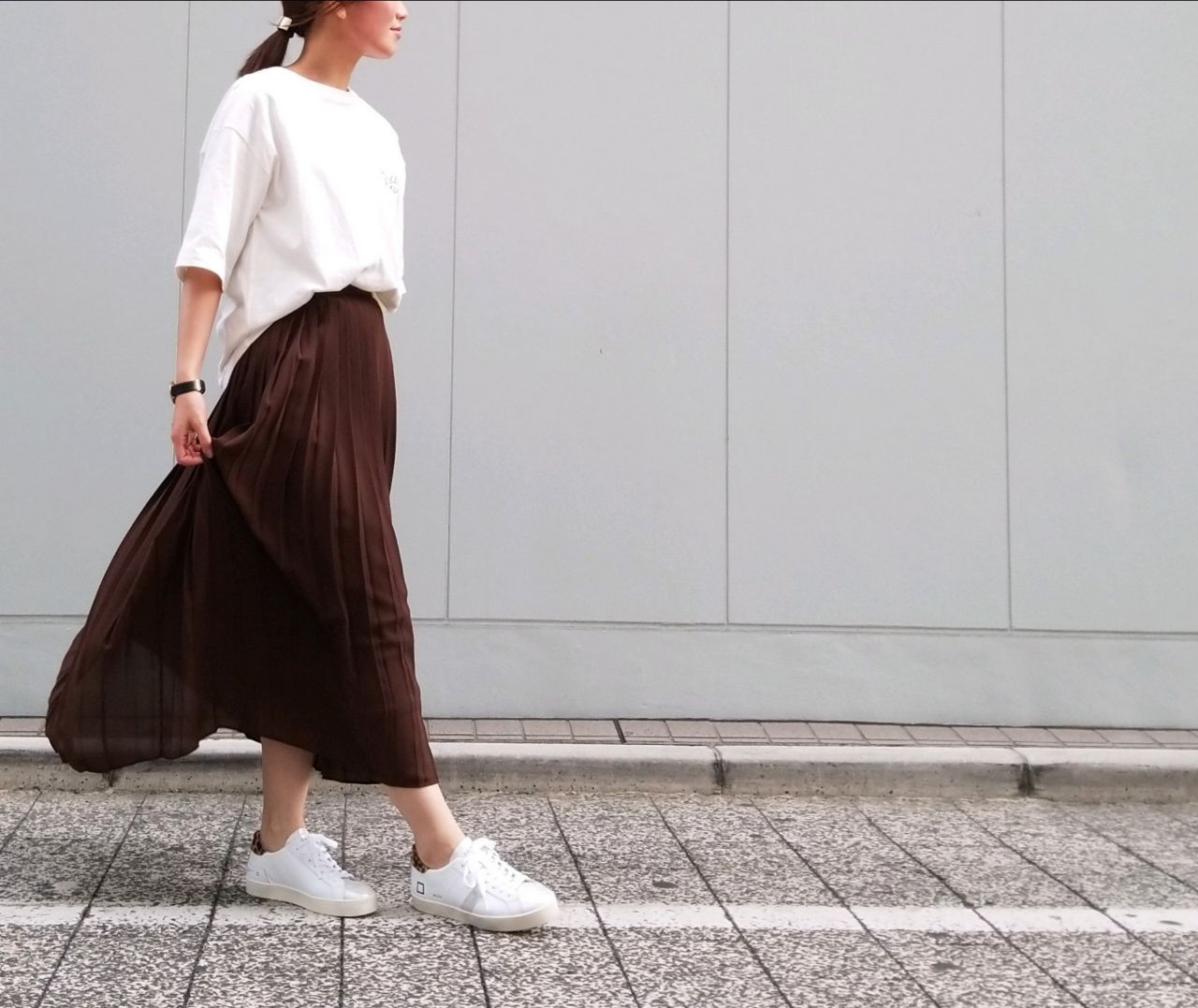 ホワイトトップス×ブラウンのプリーツスカートにC/W/Lを合わせて◎