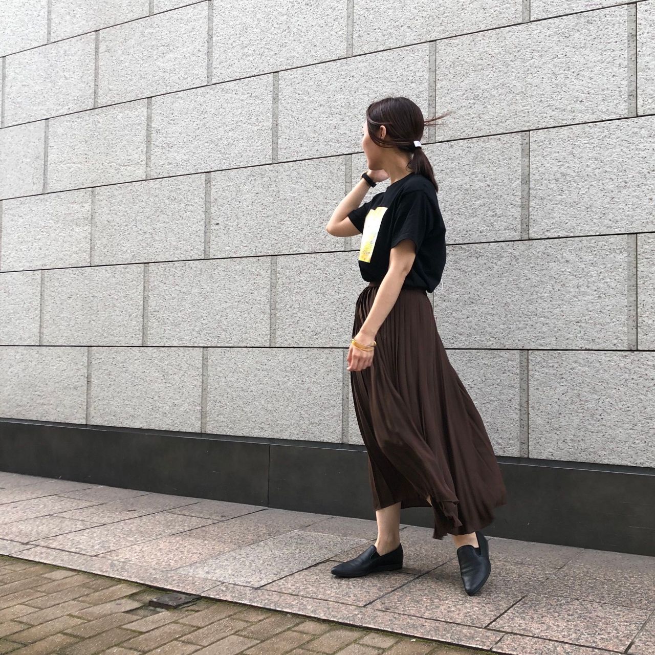 ブラックTシャツ×ブラウンのプリーツロングスカートにBL/BLを合わせて◎
