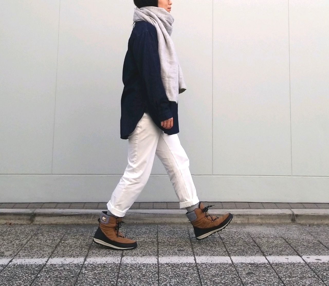ブーツがスリムなシルエットなので、縦のラインを意識することで脚長効果も◎