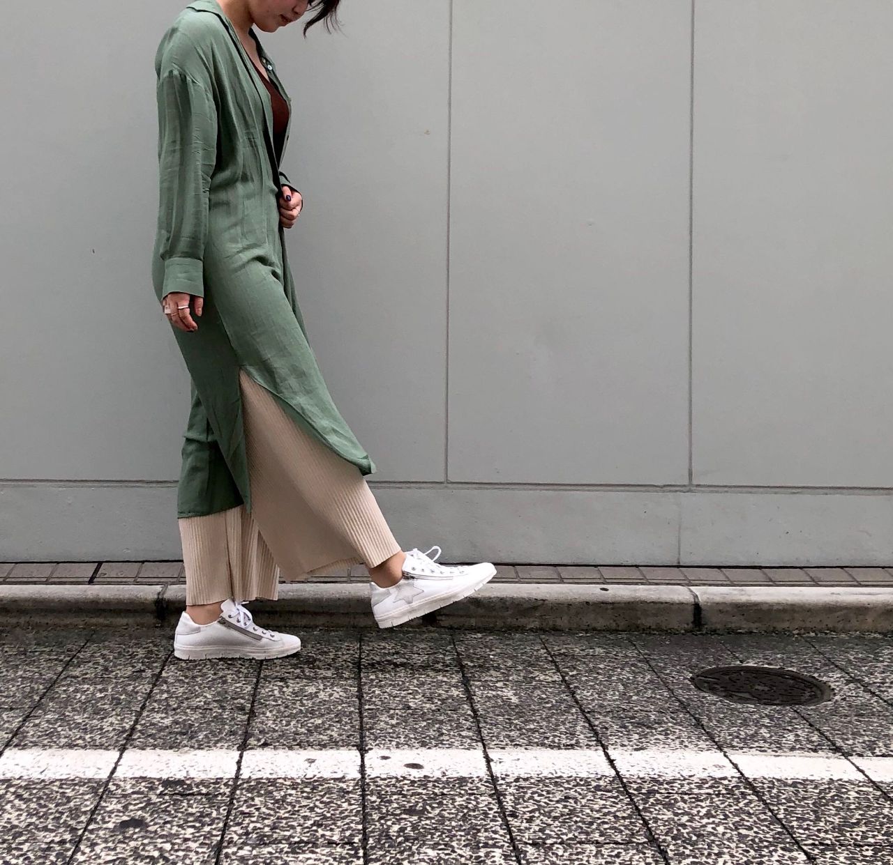 今年流行りのグリーンシャツ×アイボリーリブワイドパンツにWH/SLを合わせて◎