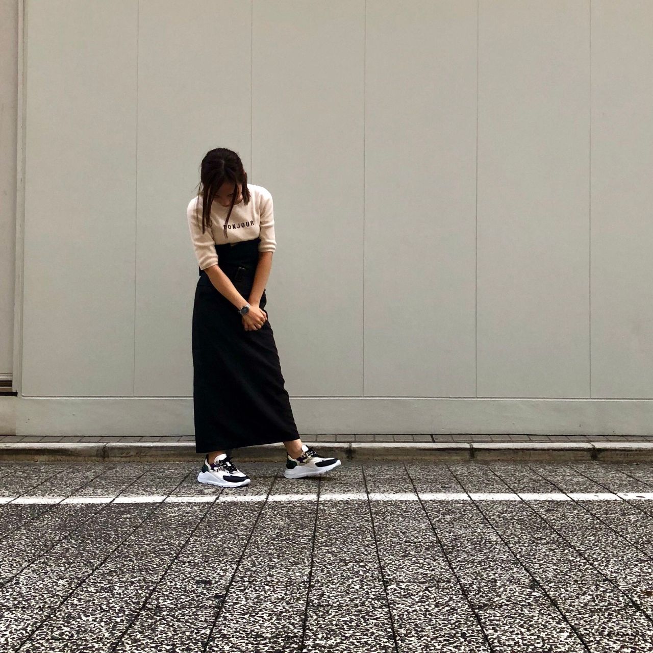 アイボリーのトップス×ブラックのハイウエストスカートにPY/WHを合わせて◎