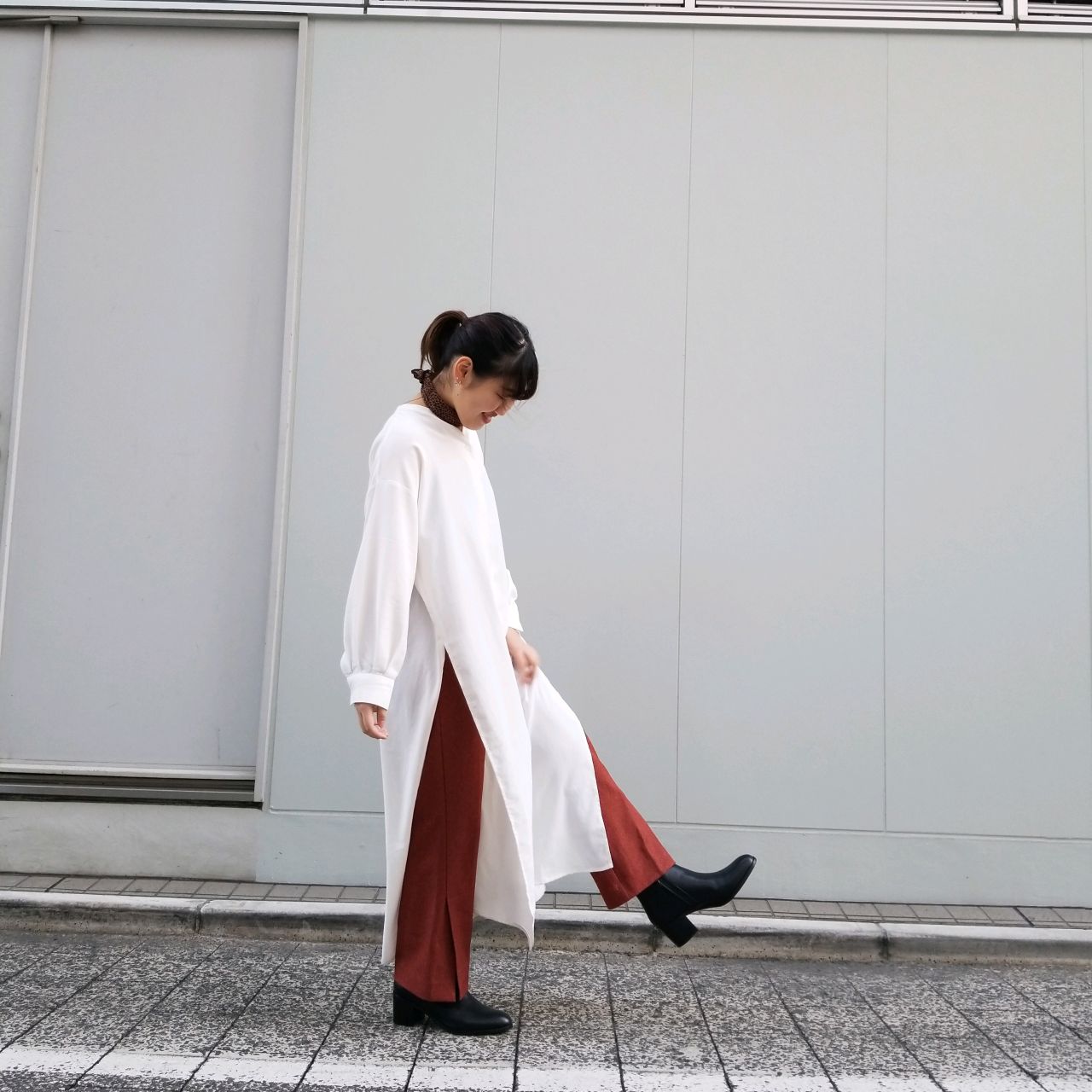 ホワイトのロングシャツ×テラコッタカラーのパンツにNEROを合わせて◎
