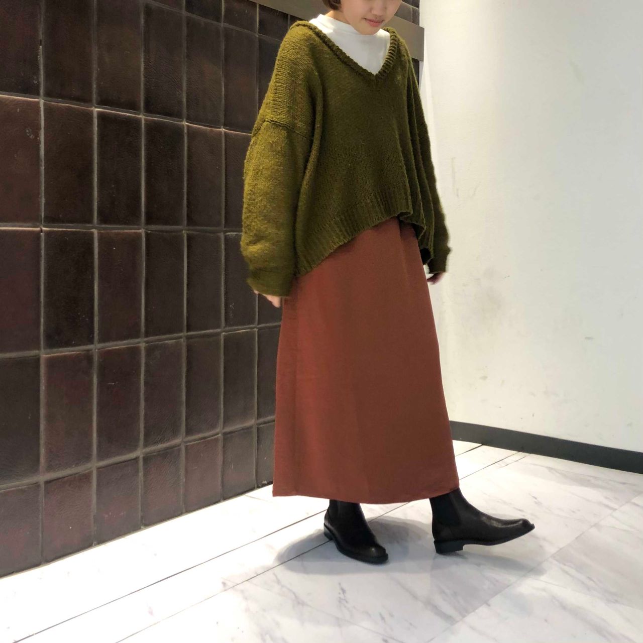 カーキのニット×テラコッタのサテンスカートにTMOROを合わせて◎