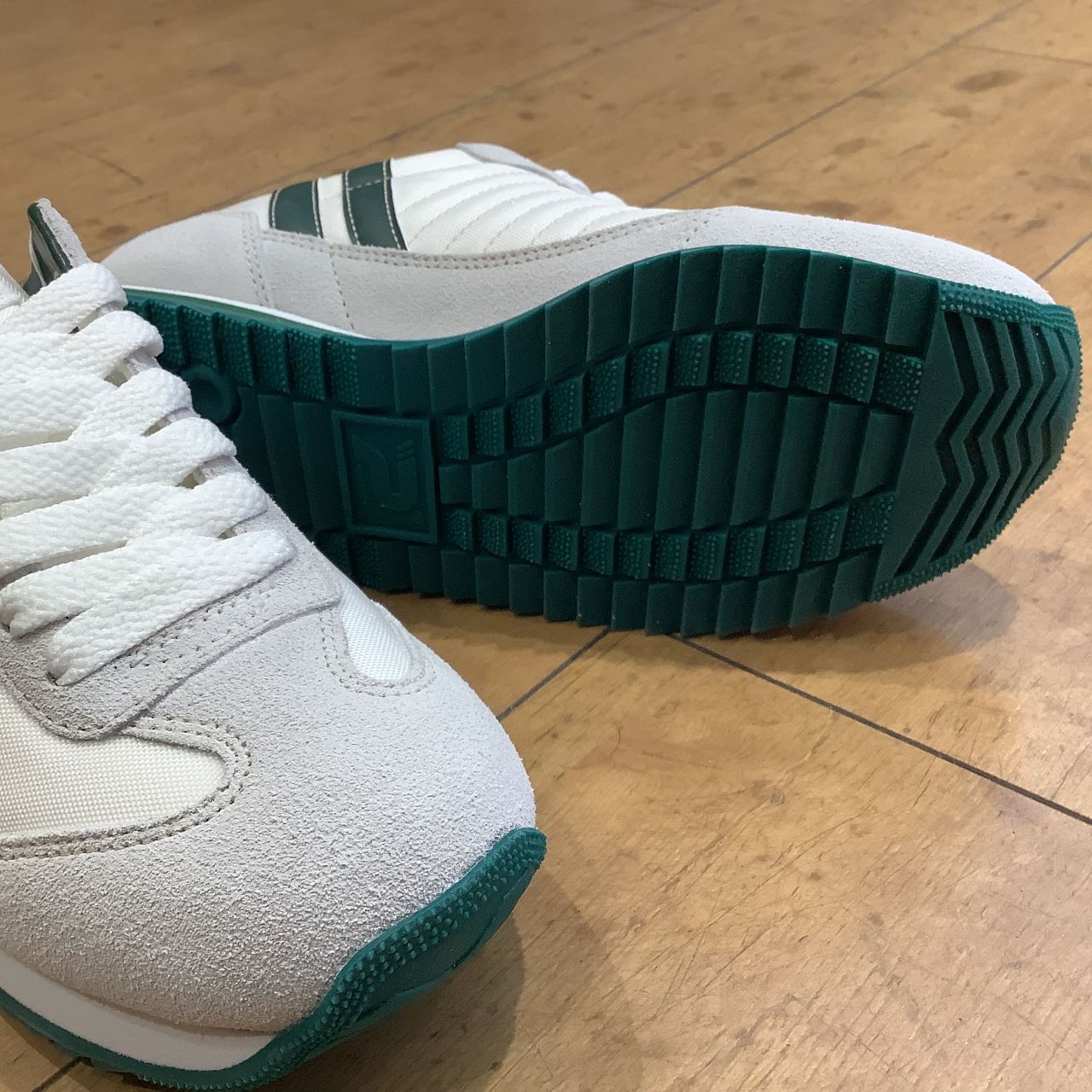 ホワイトベースのアッパーに、ビビットグリーンのアクセントが効いた一足。