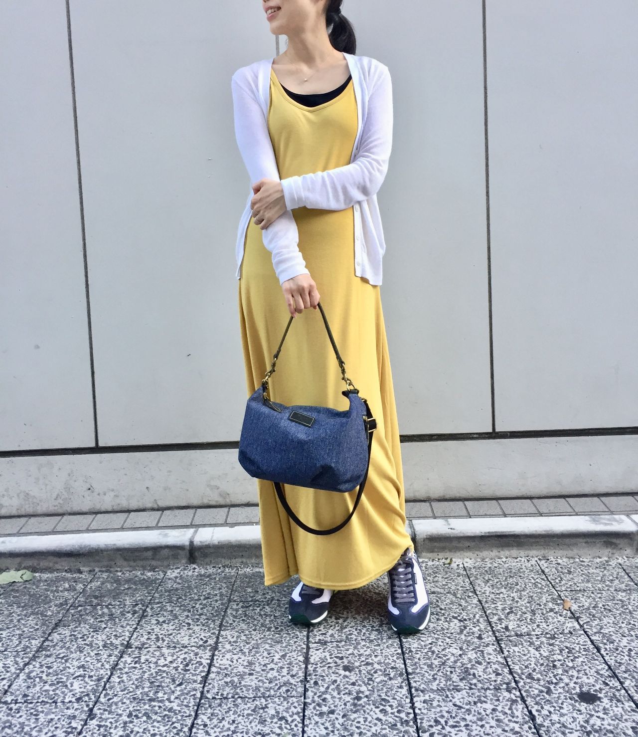 イエローのマキシ丈ワンピースとデニム地のハンドバッグに合わせて◎