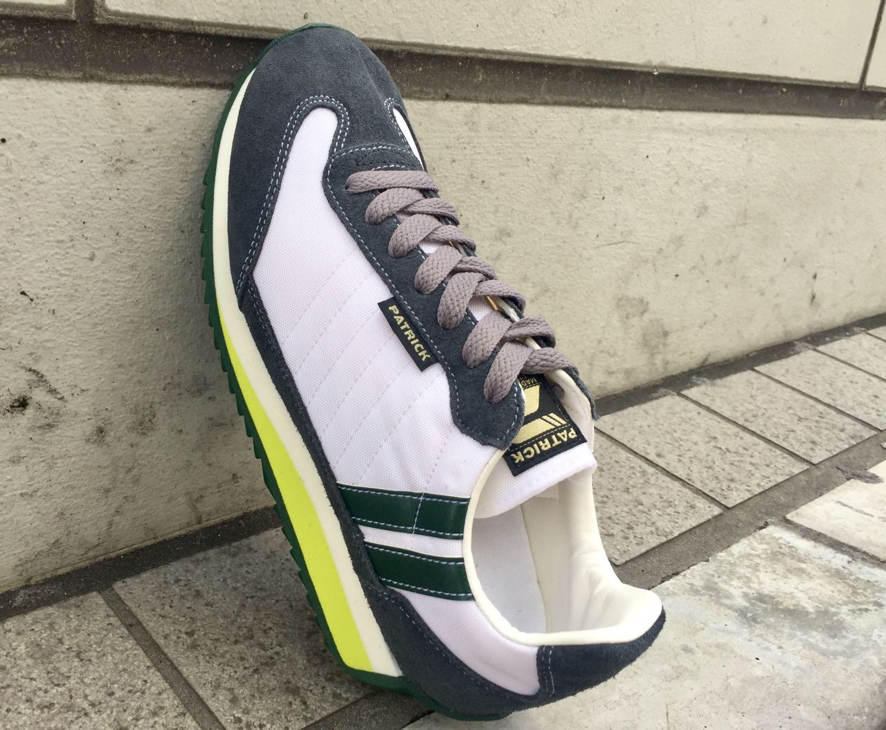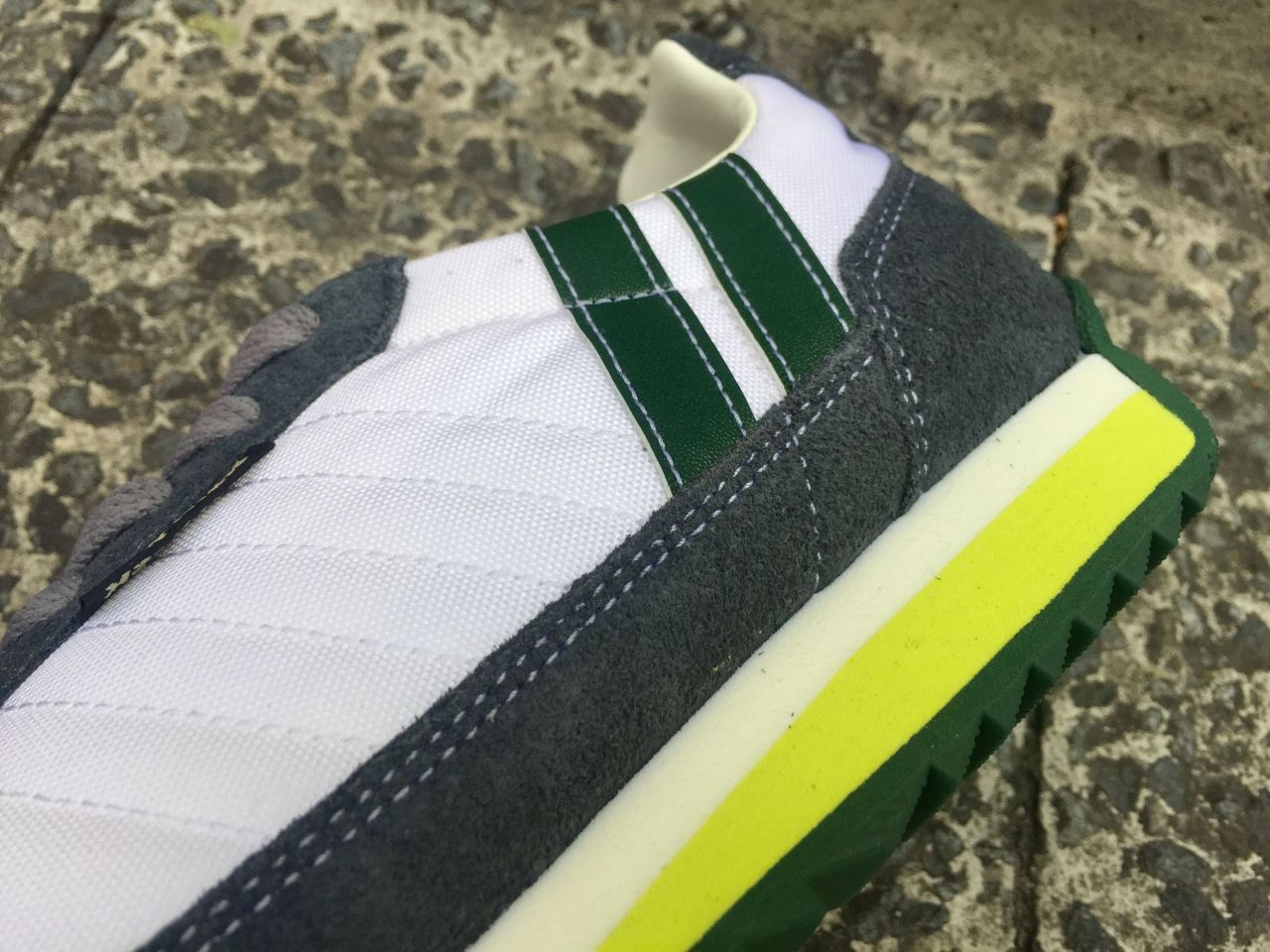 草原を彷彿とさせるモスグリーンのソールとサイドの2本ライン、アウトソールのイエローグリーンのラインが爽やかな一足です!