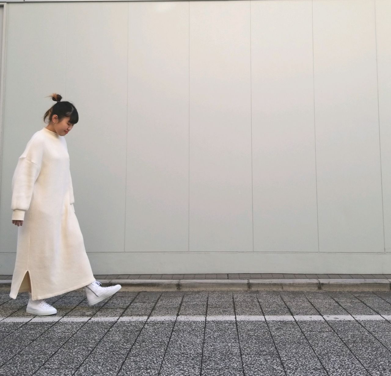 ワンピースにスリットが入っているデザインを活かしてハイカットの丈感も重たくならないコーディネートに仕上げました。