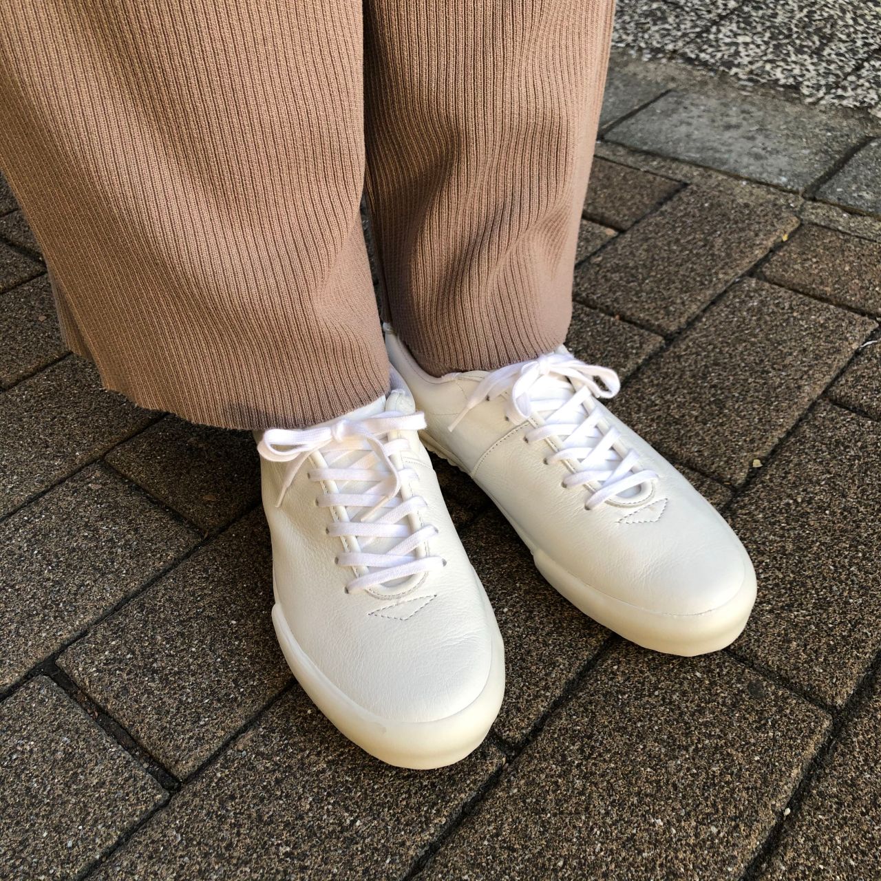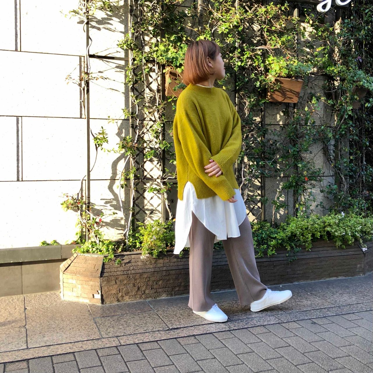 カーキニット×ベージュリブパンツにWHTを合わせて◎
