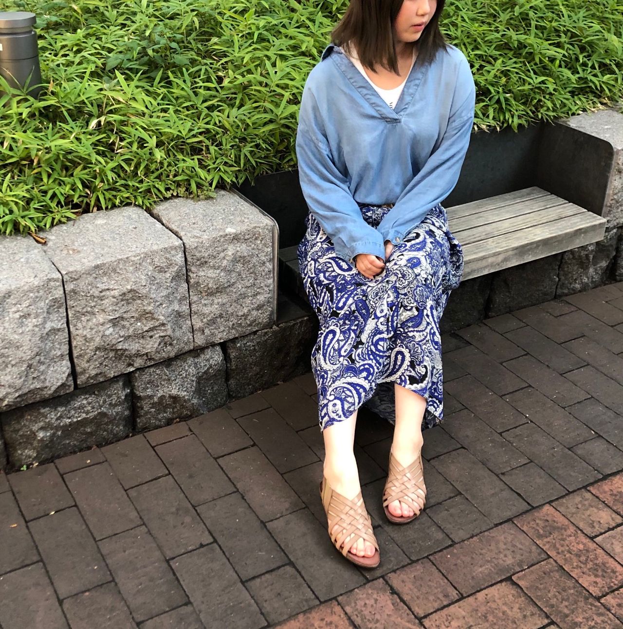 デニムシャツ×ブルーのペイズリー柄ロングスカートにLINOを合わせて◎