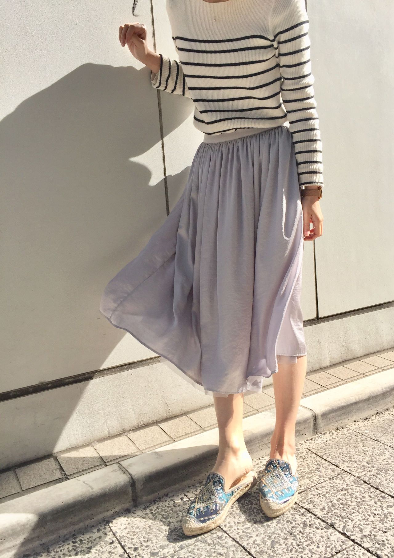 ボーダー×フレアスカートのアクセントとしてAQUAを履いてみました◎カゴバッグを合わせたくなりますね!