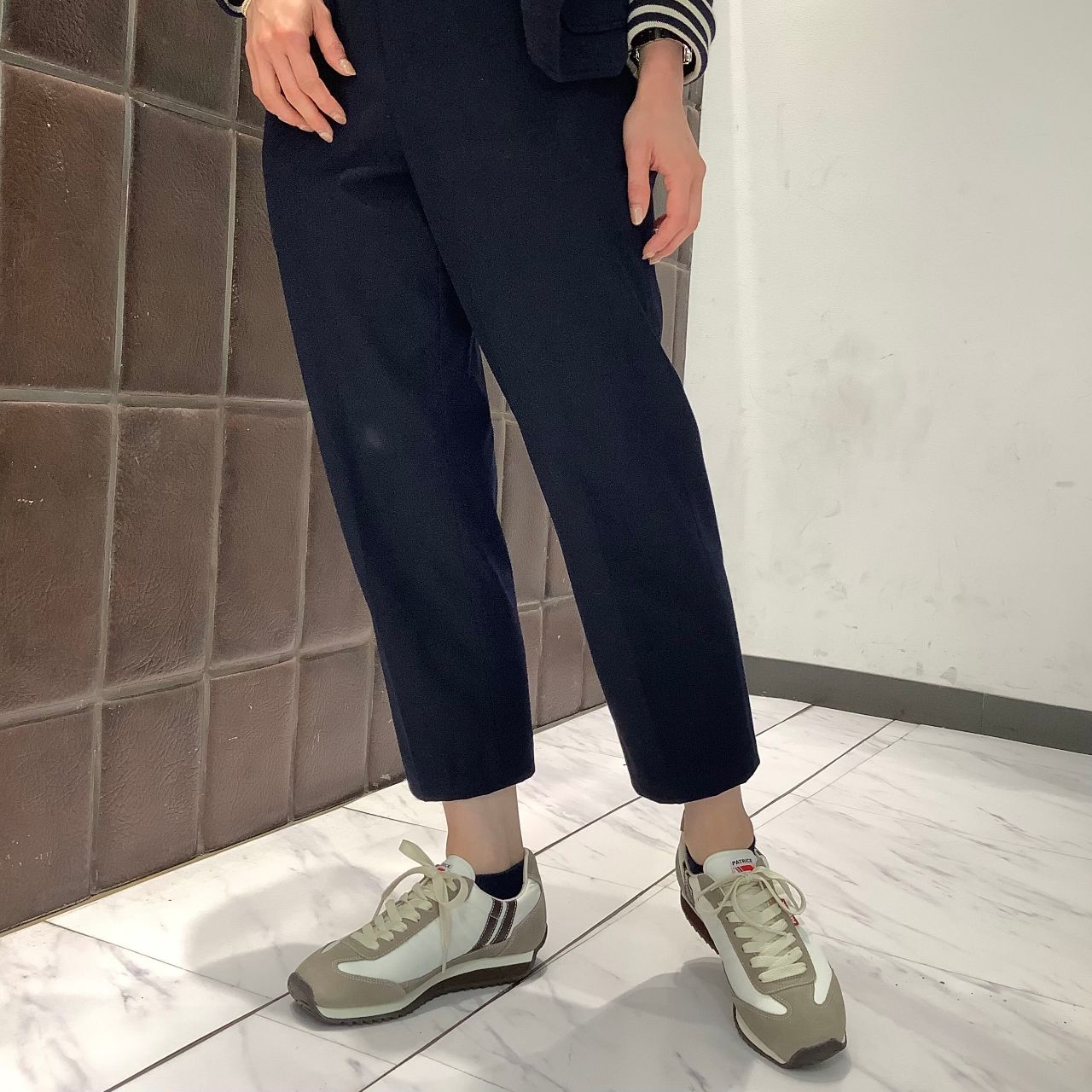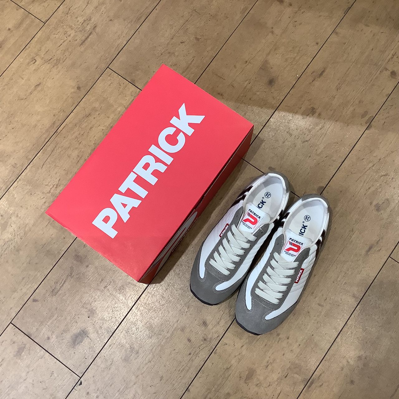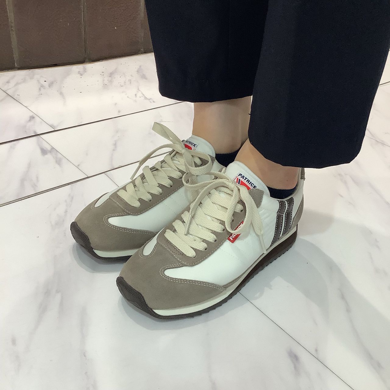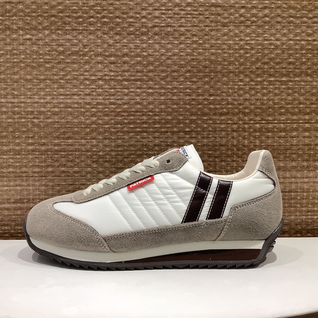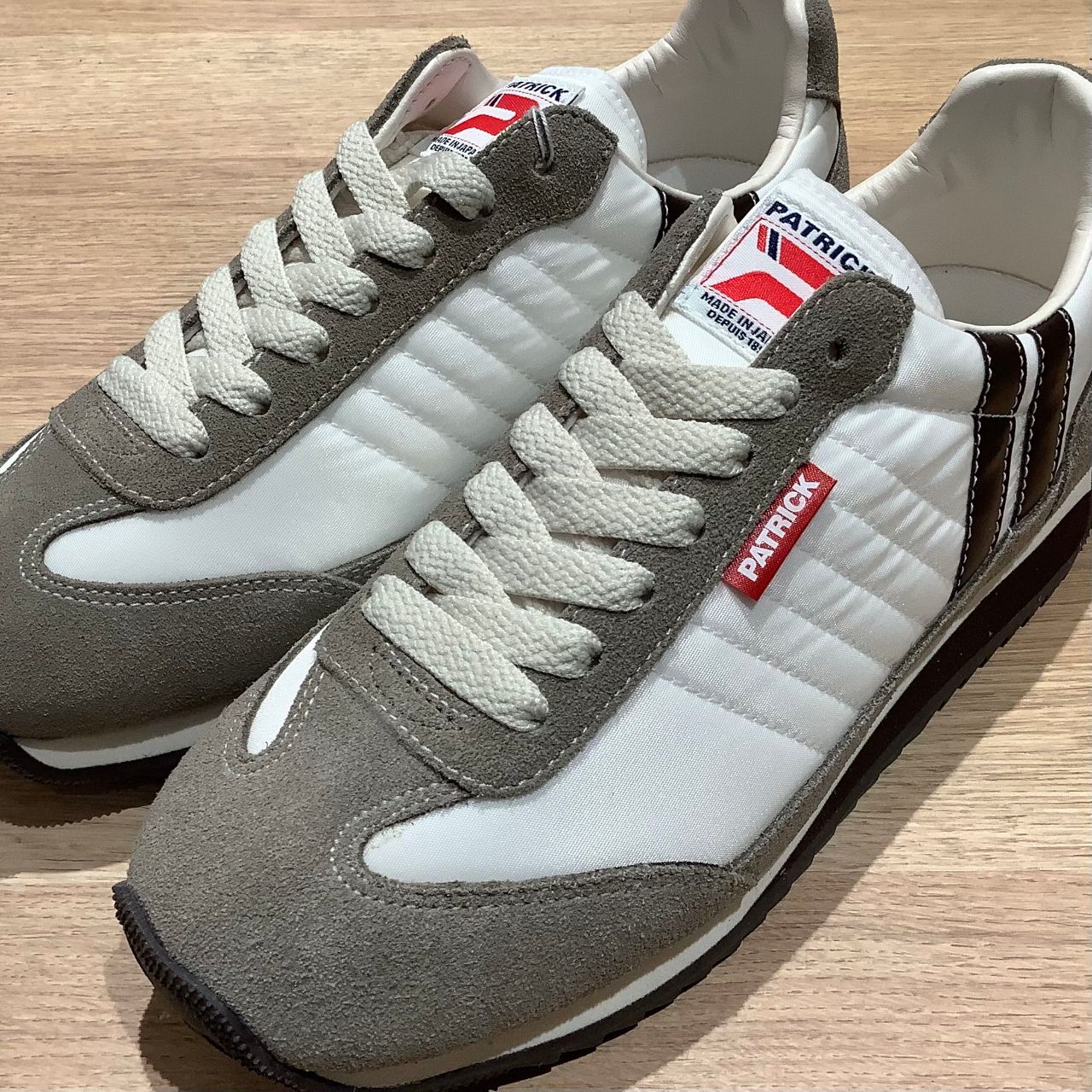 スエード部分や、パトリックのトレードマークである2本ラインにベージュブラウンがあしらわれています。