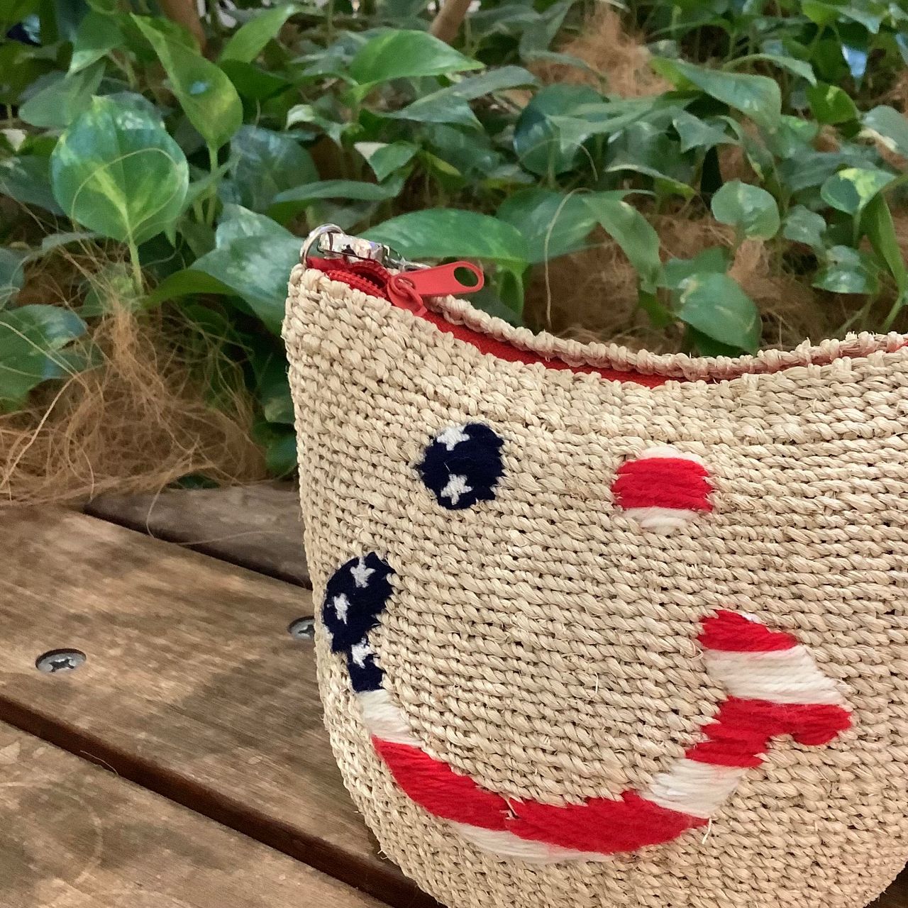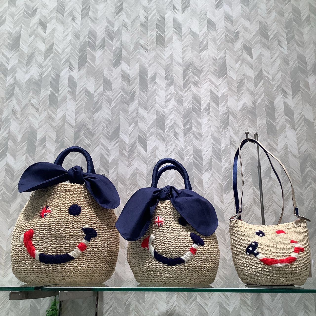 スマイルの顔が国旗の柄のユニークなデザインでアクセントになるかごバッグ☆強度と発色の良さが魅力の天然素材のアバカ(マニラ麻)を使用してしっかりと編まれた人気のカゴバッグです。さまざまな大きさがございますので、この機会にに是非、お試しください!