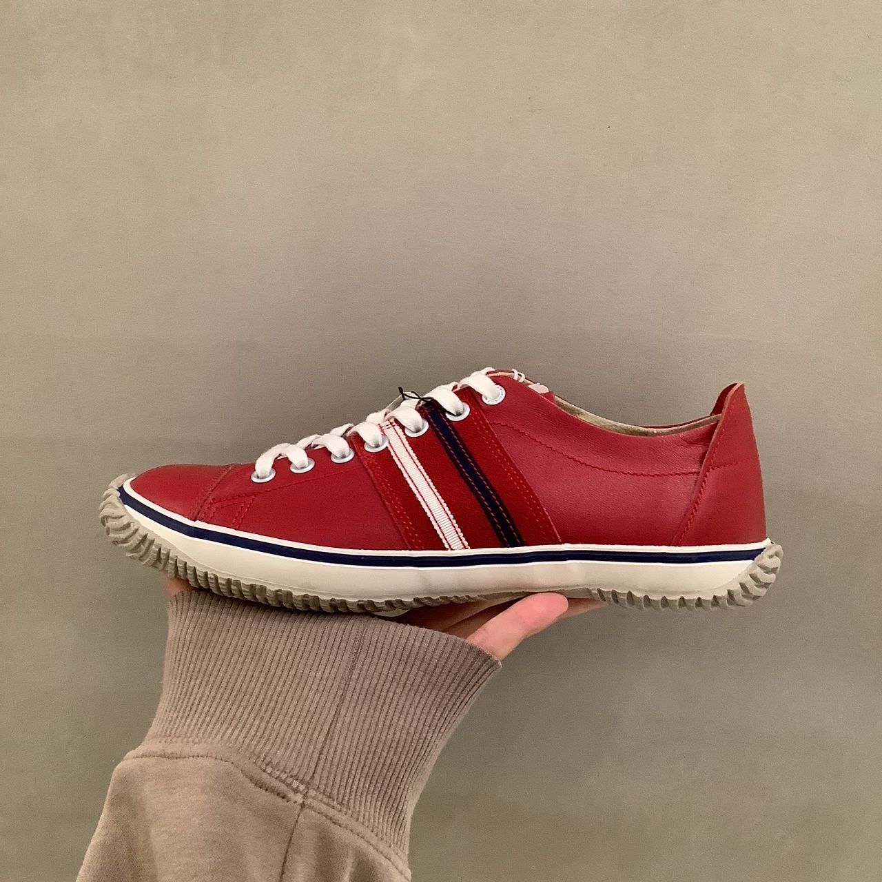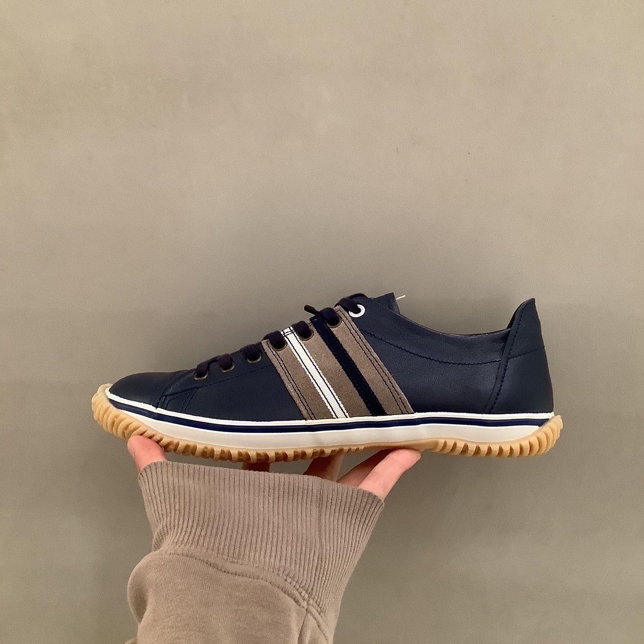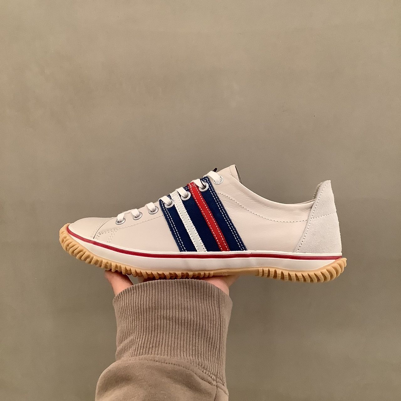 カンガルーレザーで履き心地にこだわりつつ、外側にのみ牛ベロアラインでアクセントを施した定番スニーカー。