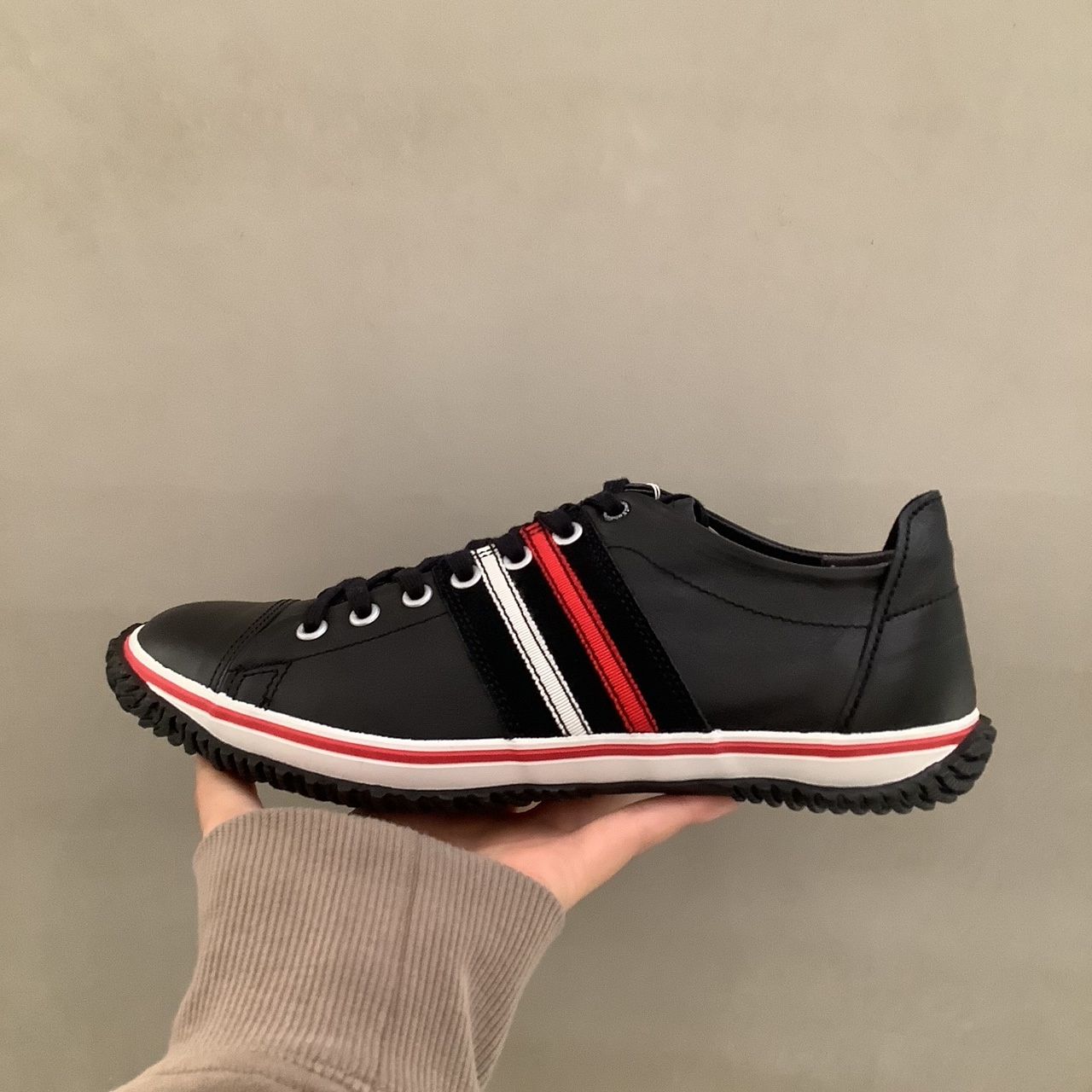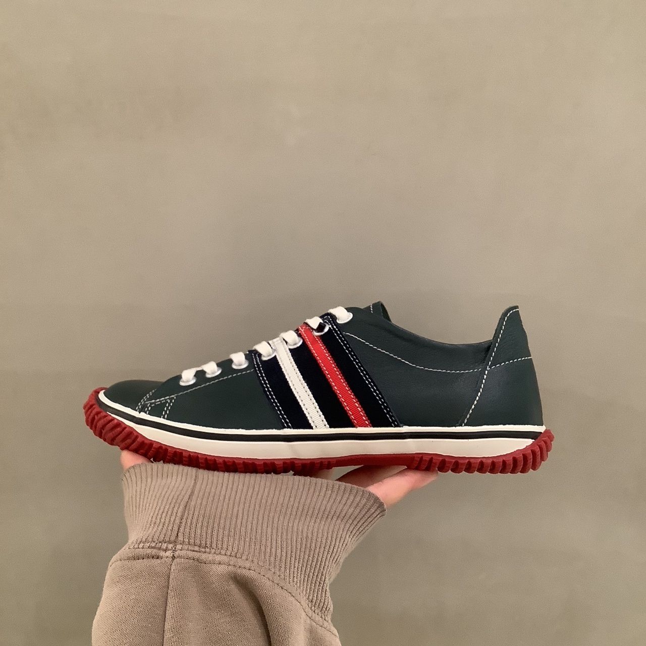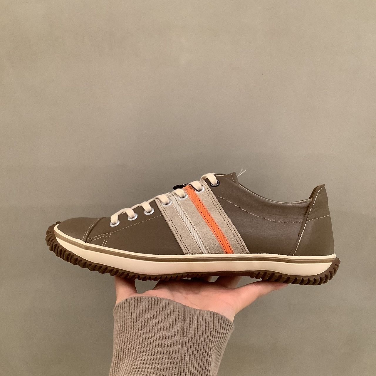 カンガルーレザーで履き心地にこだわりつつ、外側にのみ牛ベロアラインでアクセントを施した定番スニーカー。
