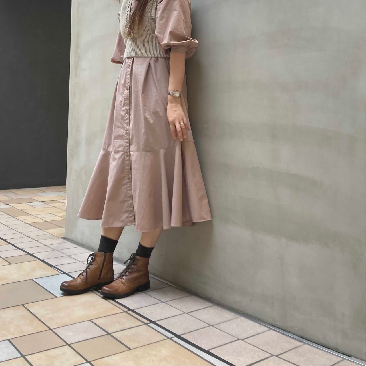 程良いボリュームのブーツなので、ワンピースなどのフェミニンコーデとの相性も◎!