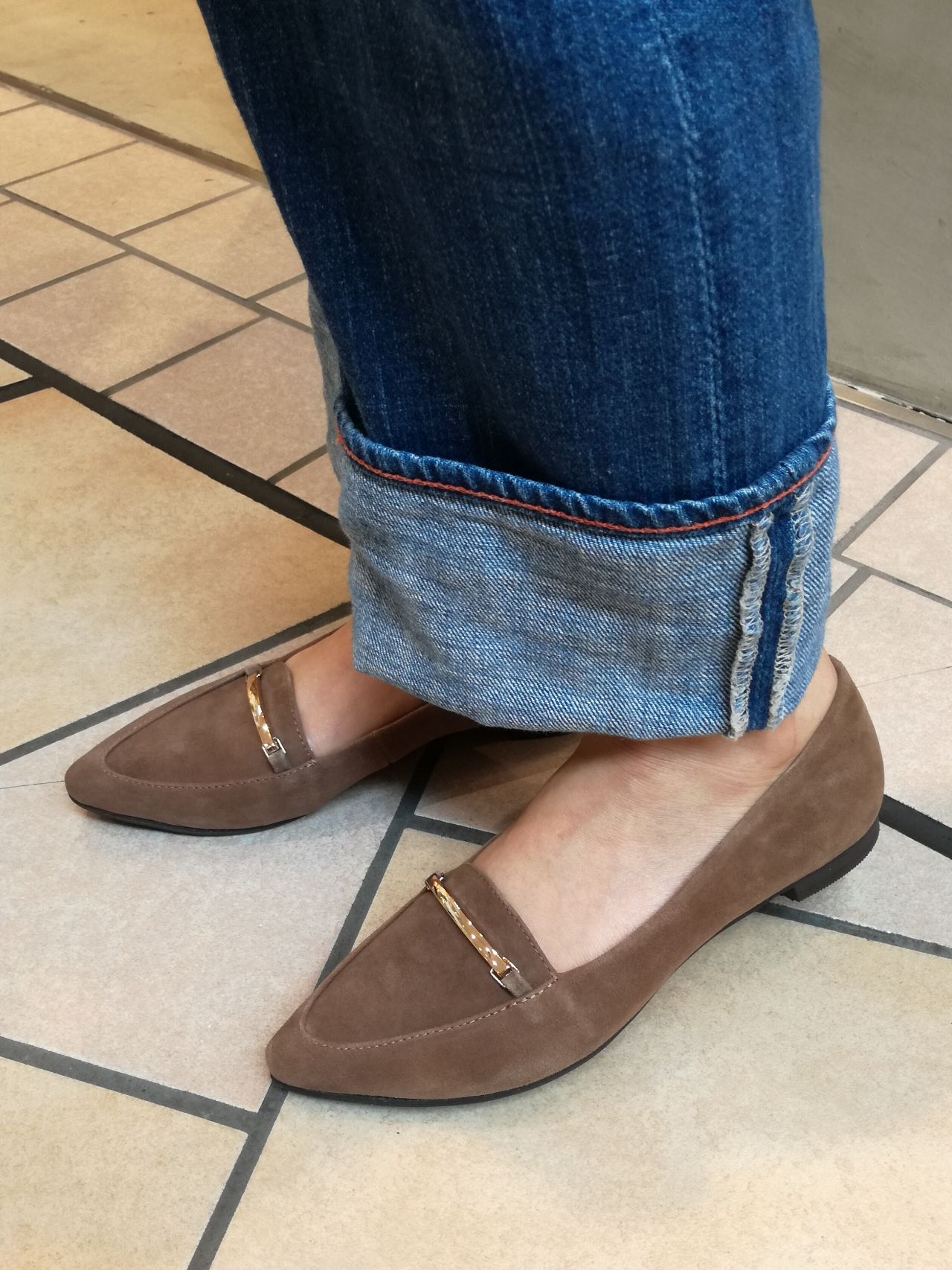 スエードのビット付きローヒールパンプスをご紹介いたします。