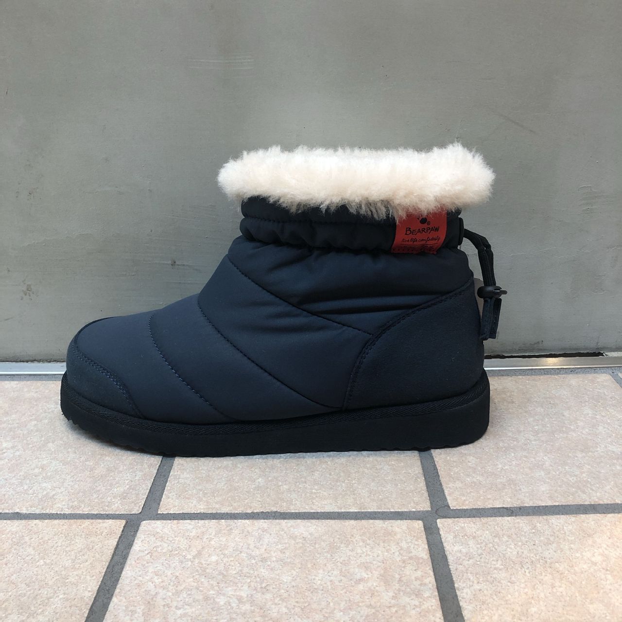 アイボリーのファーとアッパーの暗めのネイビーがカジュアルで可愛らしい一足です。