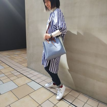 ストライプのロングシャツ×スキニーデニムで爽やかで春らしいコーデにピッタリですね(*^^*)