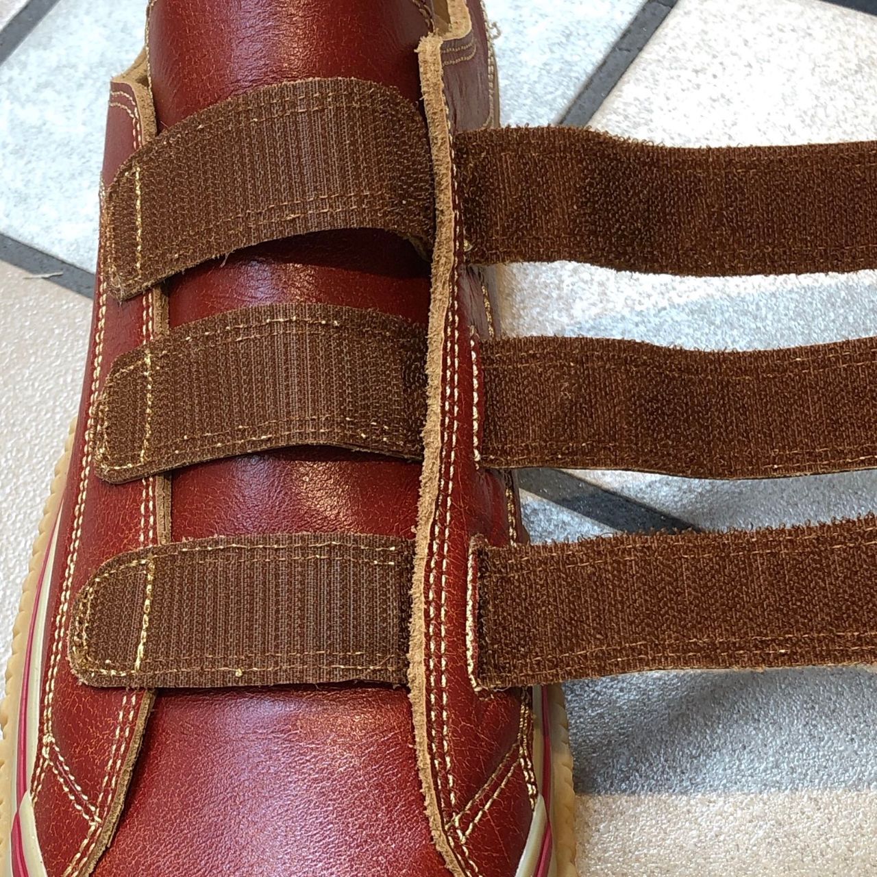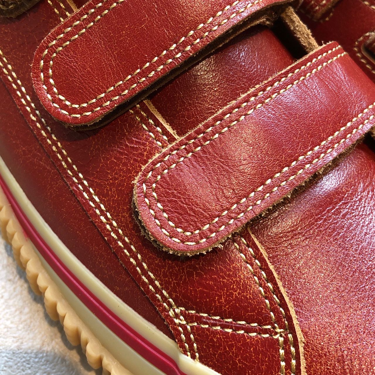 少しヒビ割れたような質感。履けば履くほど味が出てくる革となります。