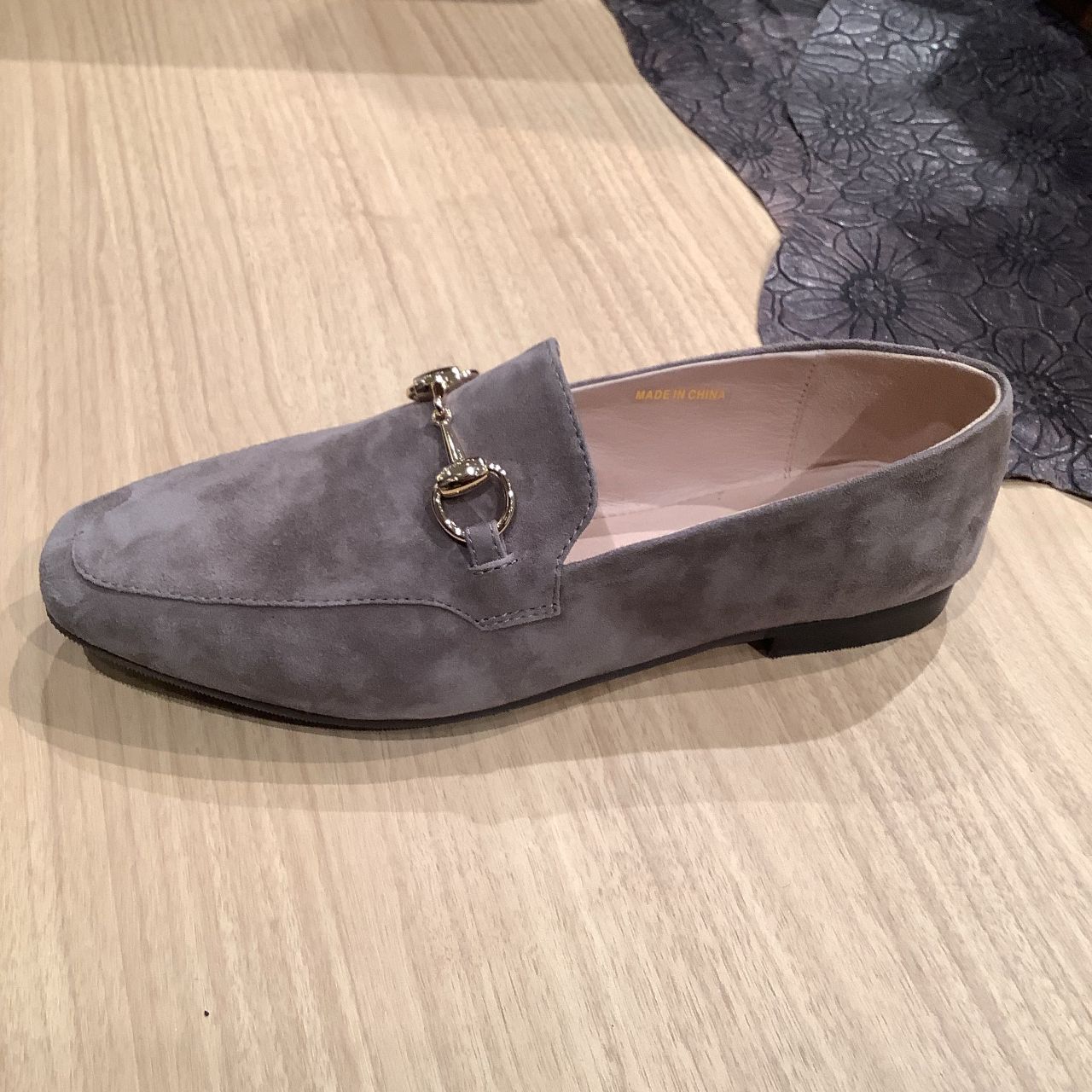 スェードのグレーが柔らかい雰囲気。上品なカラーですが、デニムでカジュアルに合わせてもかっこよく決まります。